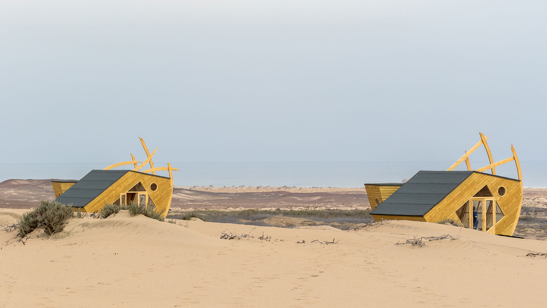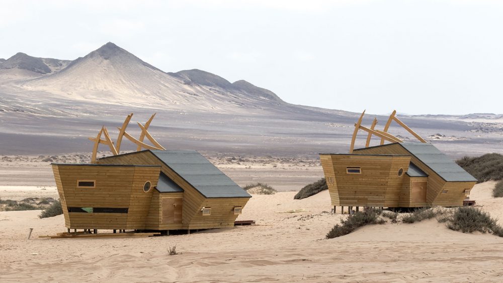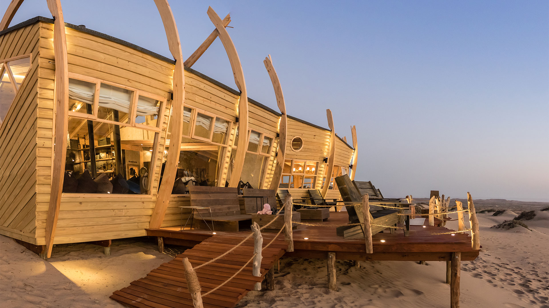 Shipwreck Lodge on Skeleton Coast in Namibia is located between the Hoarusib and Hoanib rivers in the Skeleton Coast National Park, and is just 45 km from Möwe Bay. These eye-catching and wonderfully made shipwreck-shaped chalets are placed carefully between the dunes and boast an extraordinary view of the Atlantic Ocean where the cold Benguela current provides guests with a refreshing breeze that will keep you cool in the desert setting.
