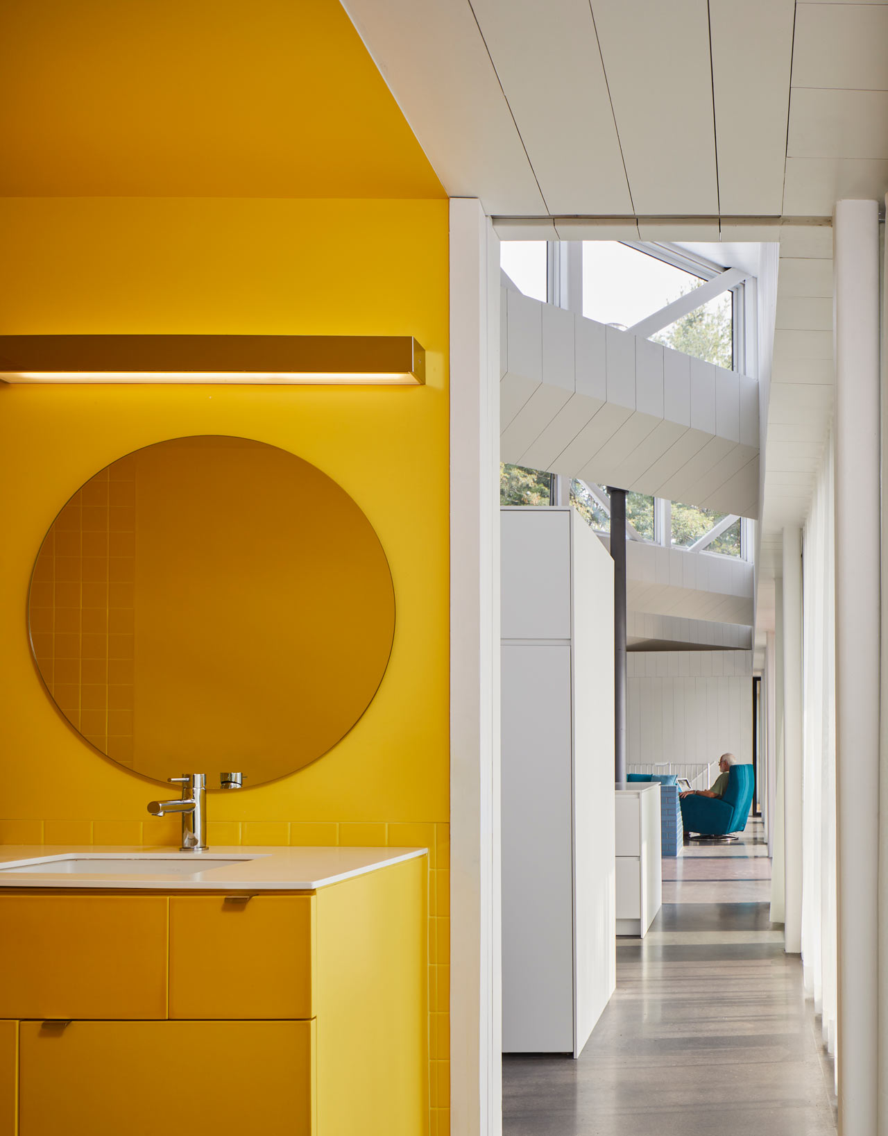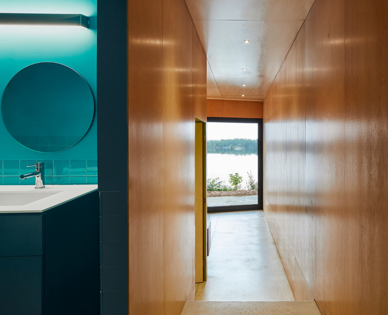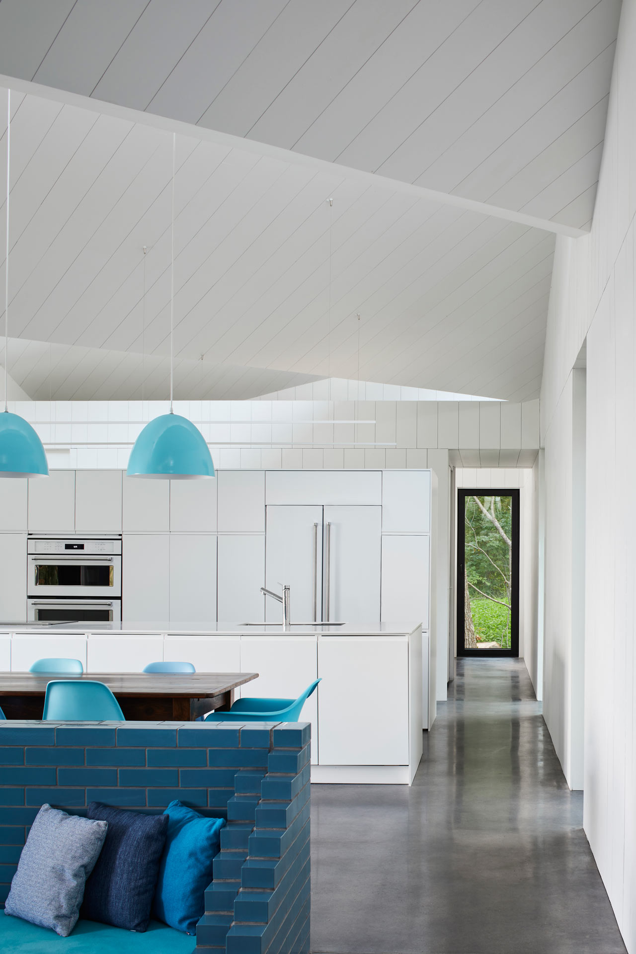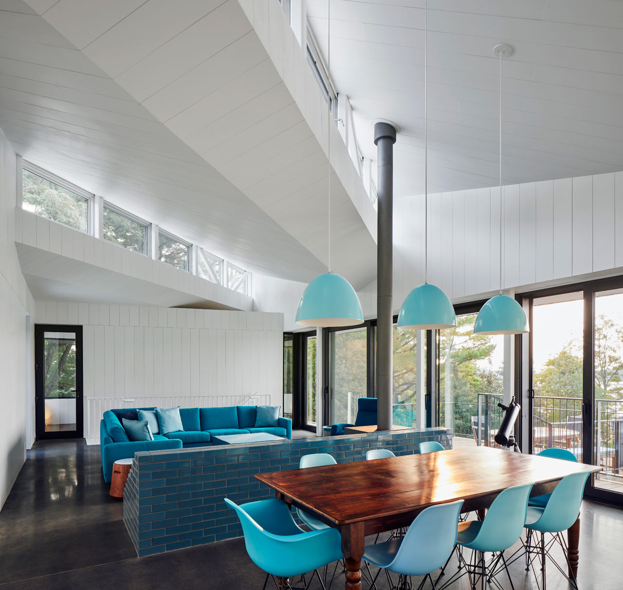 Clever uses of colour abound throughout and, in the living space, white walls and ceilings are paired with a bold, vibrant peacock blue, including a glazed brick socle that holds the wood stove. This eye-catching aesthetic certainly suits our own interior design tastes at Coolector HQ and the use of opposing colours and visuals is something which does a great job of bringing the living spaces in Sky House to life.