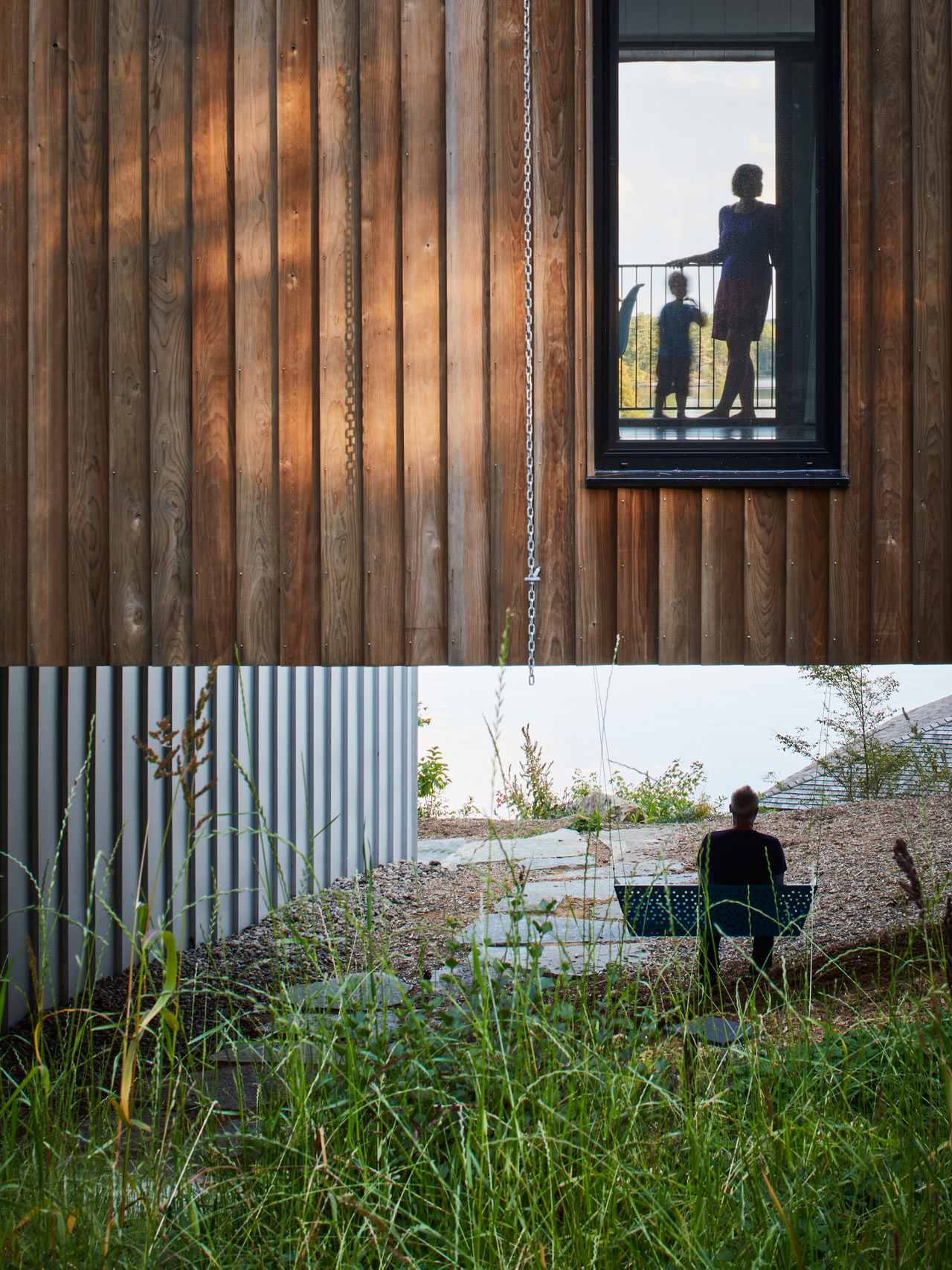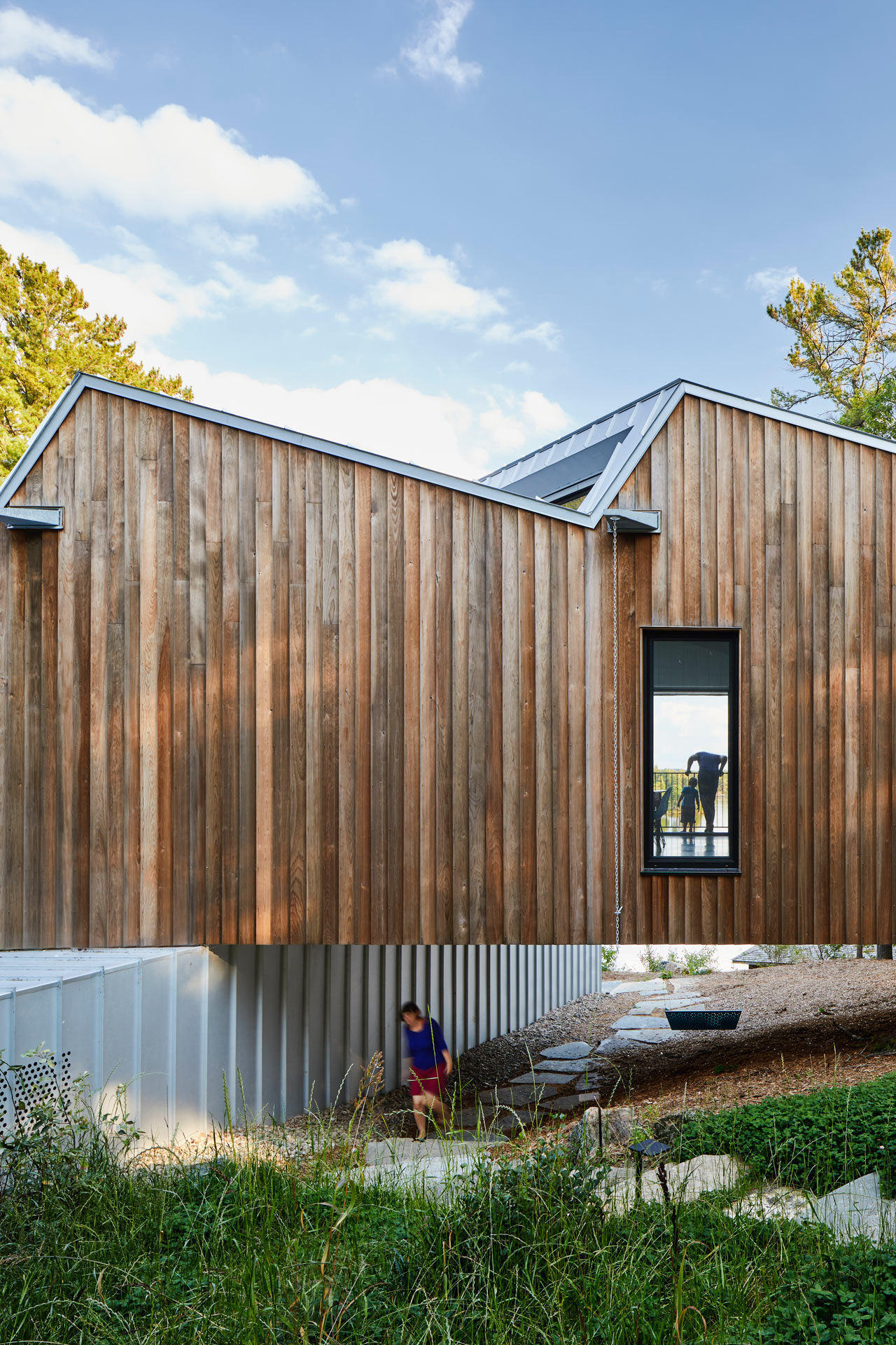 As it’s a holiday home that’s not lived in all the time, the architects decided to use robust, easy to look after materials such as reflective standing seam metal roofing and petrified wood to clad the exterior of the glorious looking Sky House on the shores of Stoney Lake in Canada. The interiors of the property are bathed in natural light and within the main living space there are vertical skylights and south-facing windows alongside sliding glass doors which maximise the daylight.