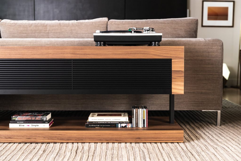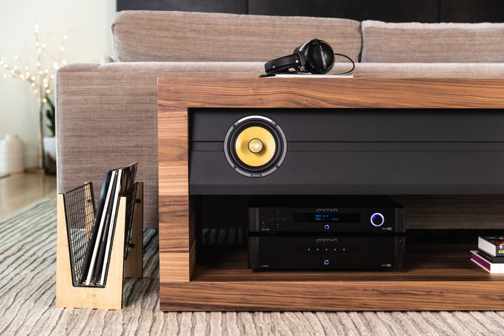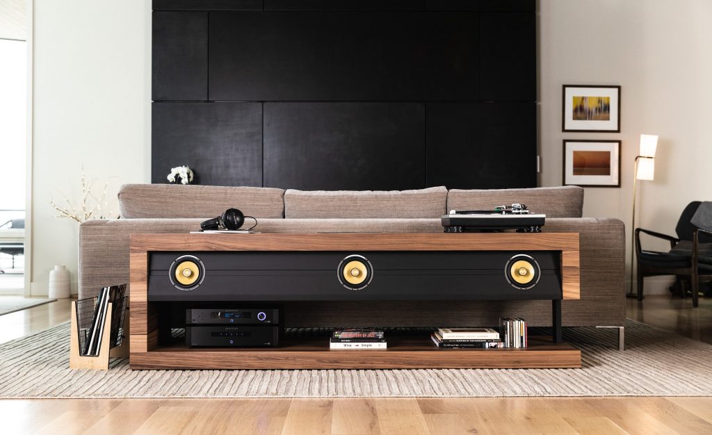 The Slab Console™ ($6,995) has passive left, centre, and right channel speakers in addition to a recessed active subwoofer for an unparalleled audio performance. This stunning credenza can effortlessly replace four freestanding speakers in one understated, contemporary and musical console. You can add an A/V Receiver or Amplifier / Processor combo of your choice and enjoy music and movies like never before.