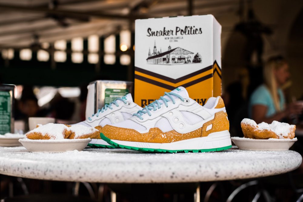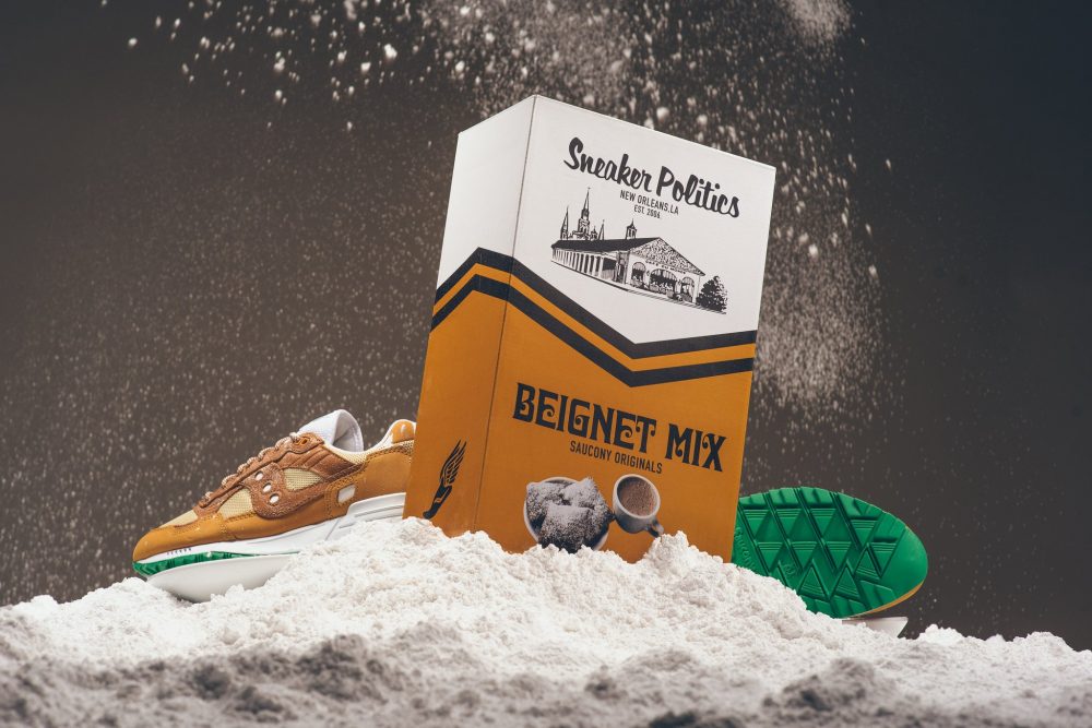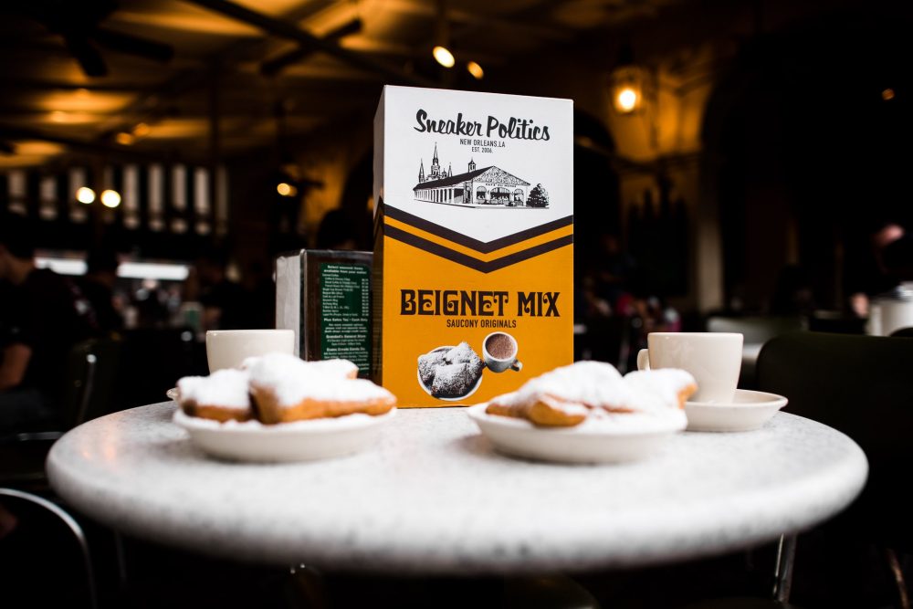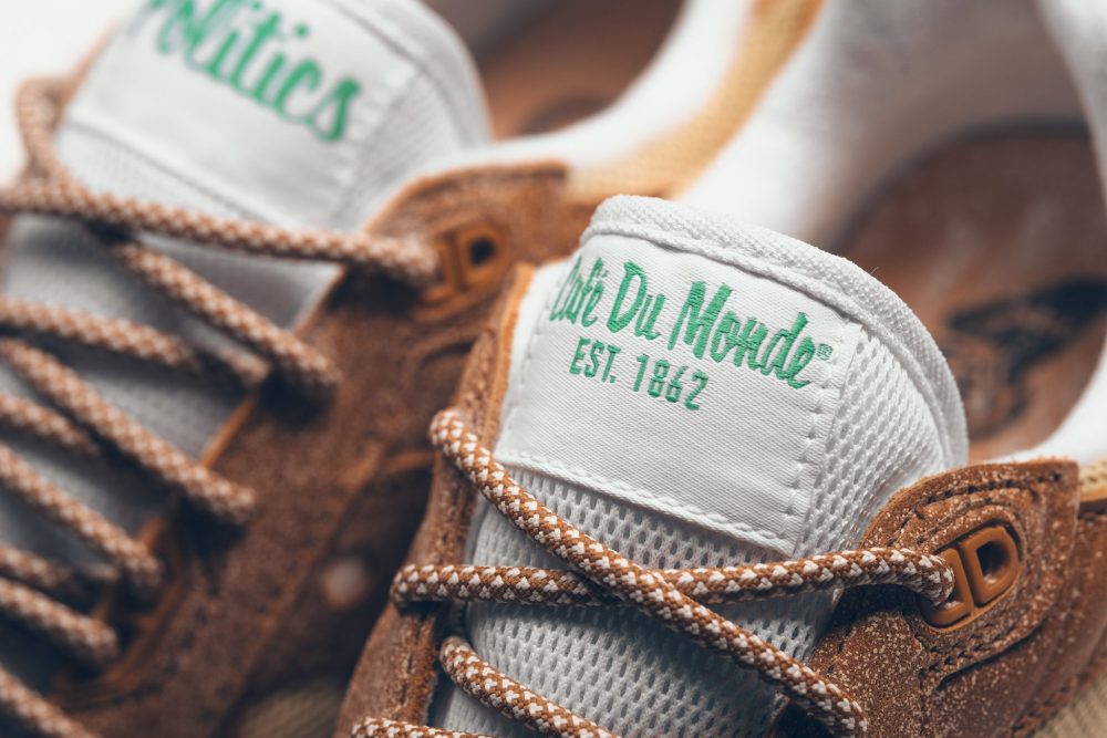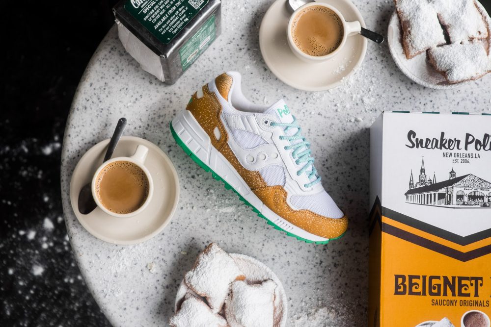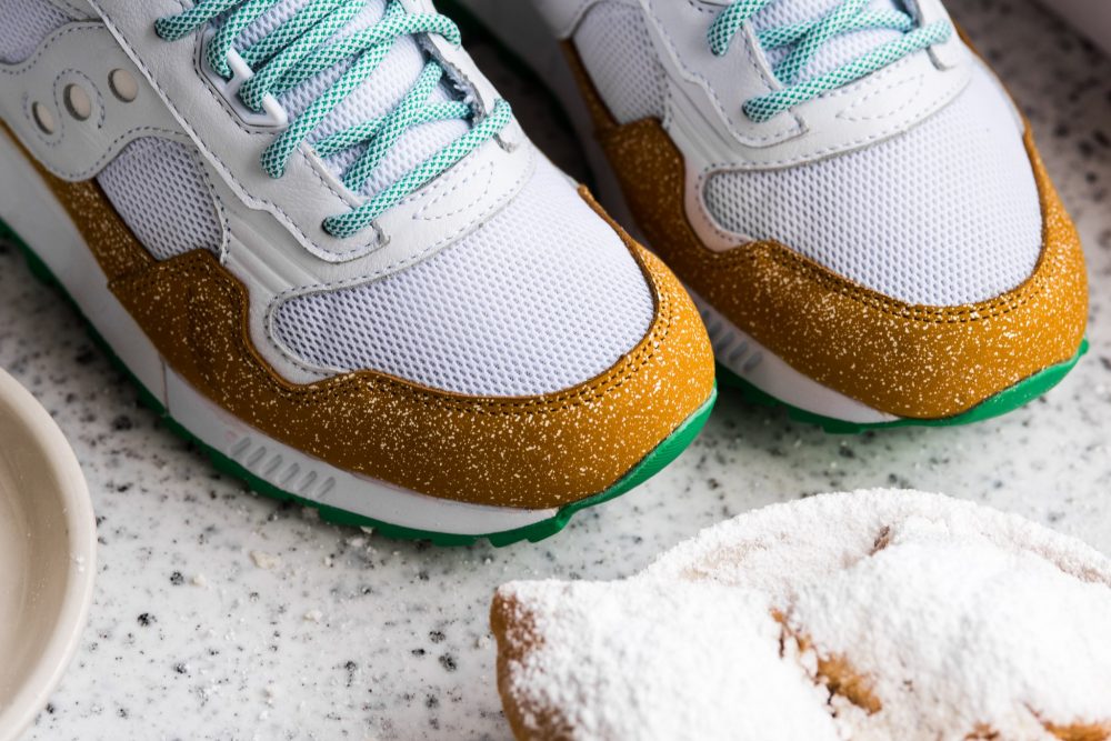 The Sneaker Politics x Saucony x Cafe Du Monde Shadow 5000 Sneakers ($120) have a co-branded tongue and particularly striking green and white outsoles which are ideal for paying respect to colours of Café Du Monde’s patio overhangs. Along with the pair releasing to the public, there’s also an even more limited “Powdered Sugar” colour way hitting the digital shelves of Sneaker Politics.