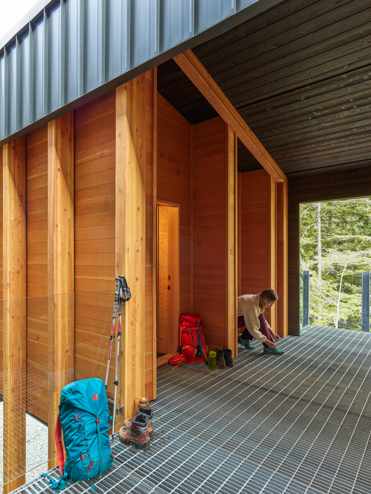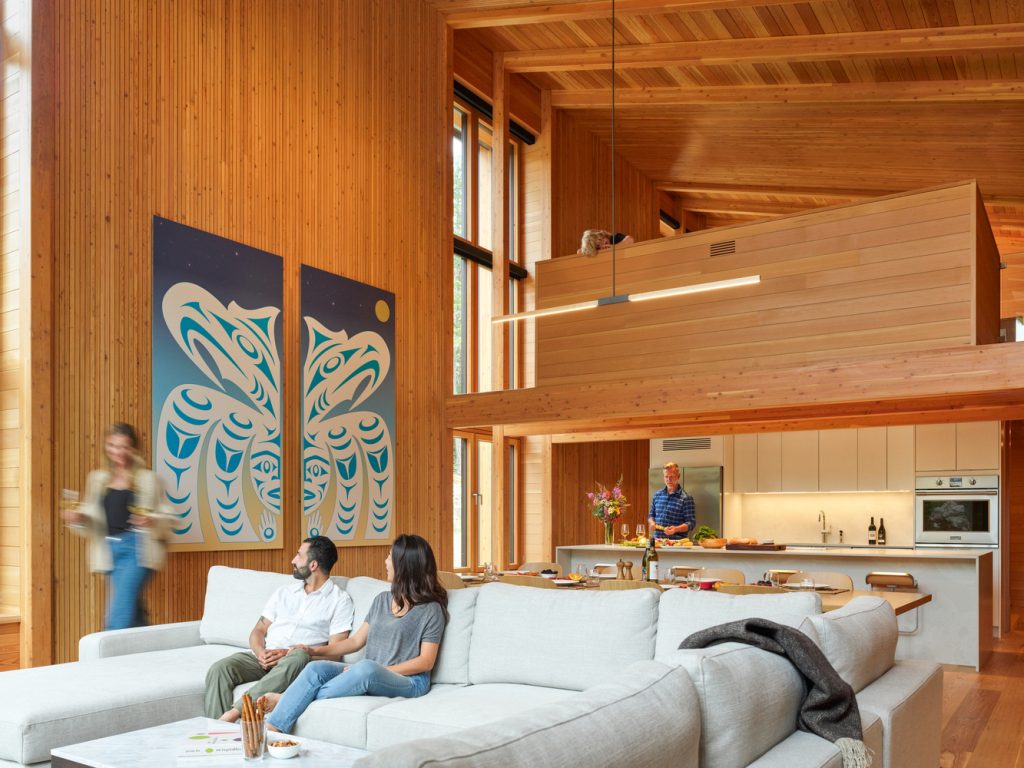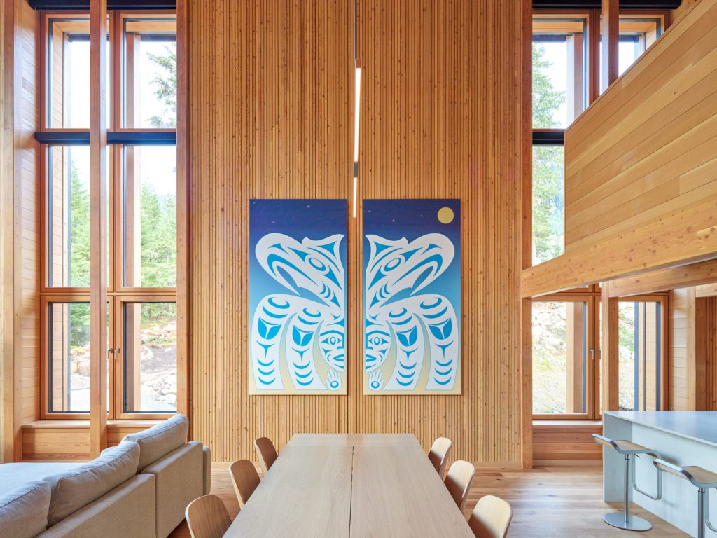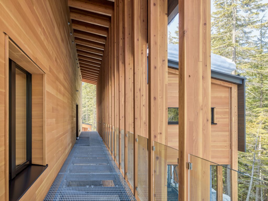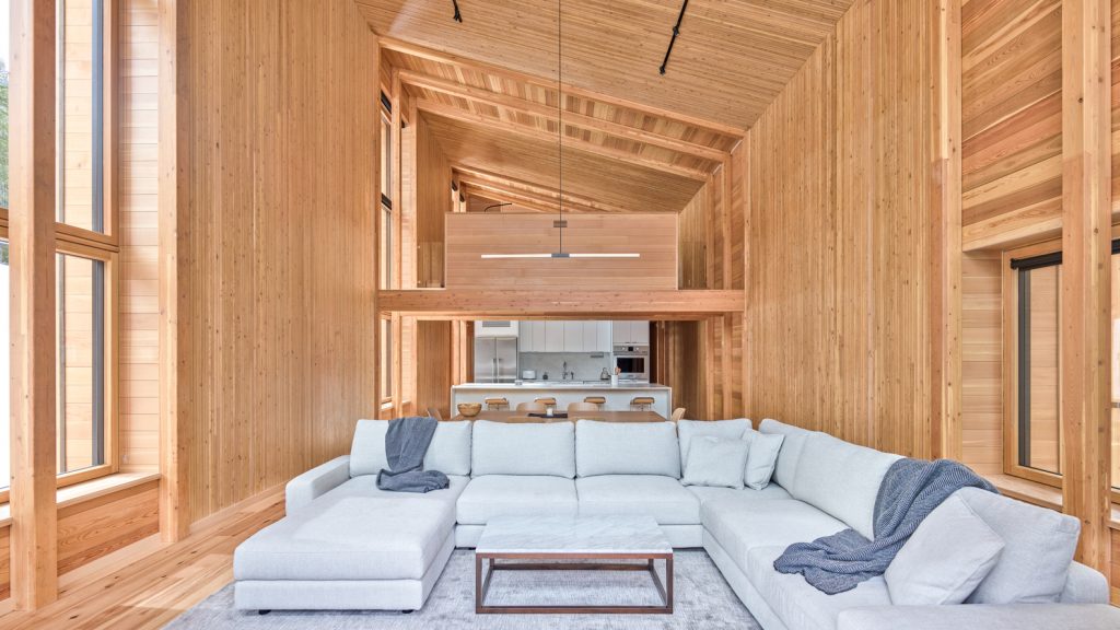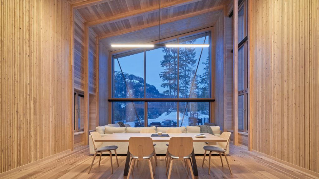 As a Passive House certified building, wood was picked as the primary structural material for SoLo House and is authentically expressed and exposed in its entirety throughout the beautiful property in Canada in what the architects call a ‘temple to douglas fir’. Due to the extreme climate, it was important to have an ‘enclosure-first’ approach to make sure energy efficiency was on point. Employing Passive House principles, Perkins&Will applied a two-layer approach to the home – namely, an outer heavy timber frame which acts as a shield, resisting the weather, while the heavily insulated inner layer acts as the thermal barrier.