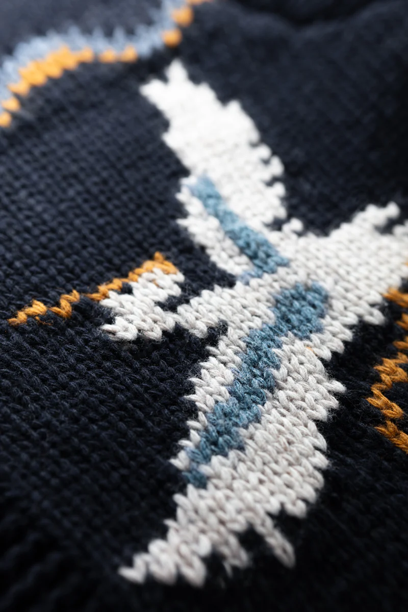 Crafted from a luxurious blend of 50% lambswool, 25% polyamide, and 25% viscose, the Crane Cardigan embodies warmth and comfort, making it ideal for those crisp autumn days and chilly evenings. What sets this cardigan apart is the bespoke crane jacquard design, which adds a unique, artistic flair to an otherwise classic wardrobe staple. The crane motif speaks to a spirit of exploration and adventure, a nod to those who appreciate garments that tell a story—a story of heritage, quality, and adventure.