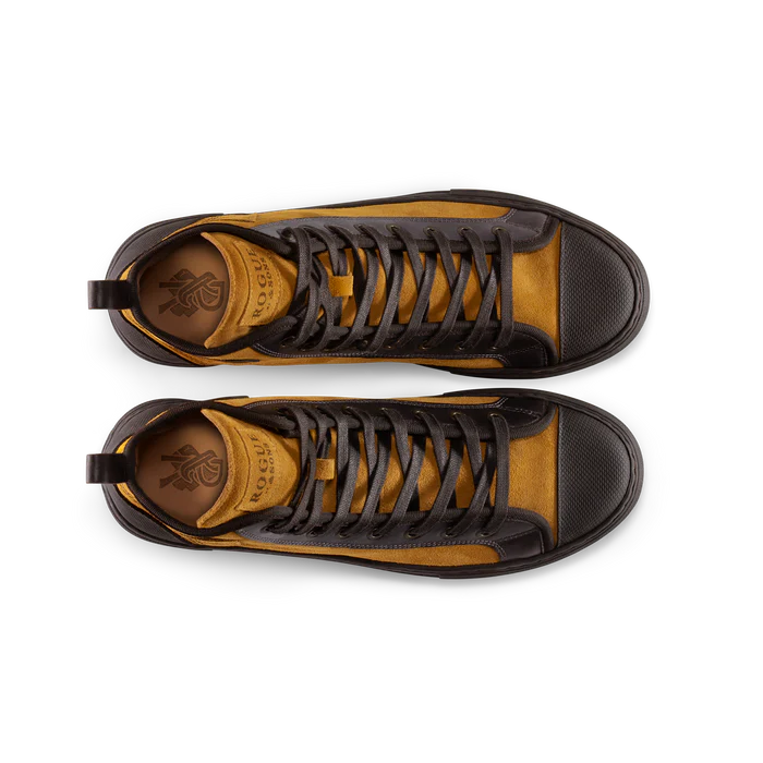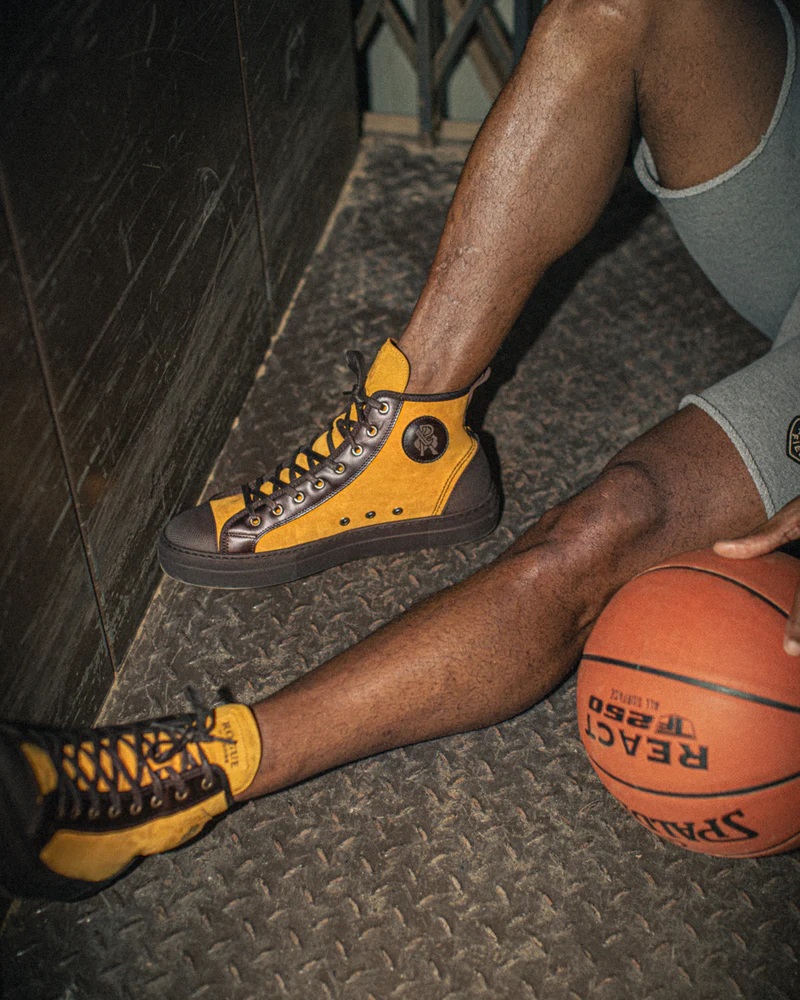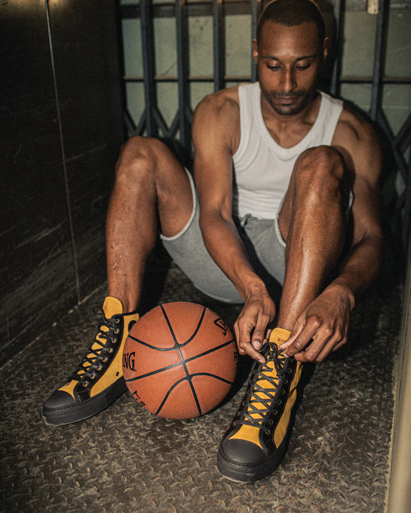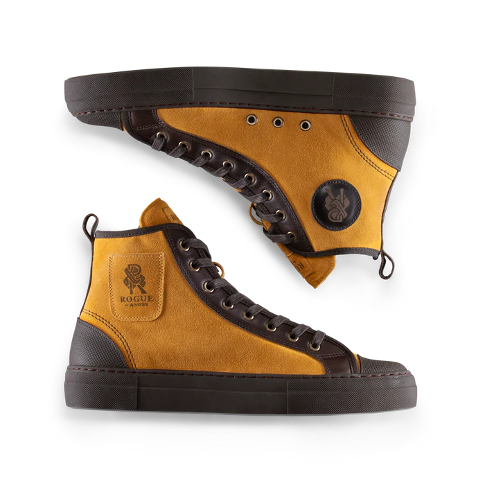 The hi-top silhouette earned its place on the blacktops of America, where music poured from open windows and sweat hit the asphalt in time with the bouncing ball. High tops were the uniform of those hours, laced high and worn hard, carrying the weight of games that went on until the sun dropped and the streetlights buzzed to life. They weren’t meant to stay clean—the scuffs were the point, each one a mark of persistence and pride. The &SONS ROGUE Baseline Hi Top carries that legacy. It’s a nod to those sweat-soaked summers when the game was raw, relentless, and real. This is footwear for the discerning gentleman who understands that true style isn’t about what’s new; it’s about what endures.