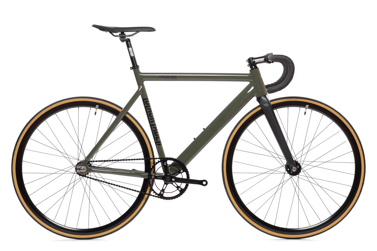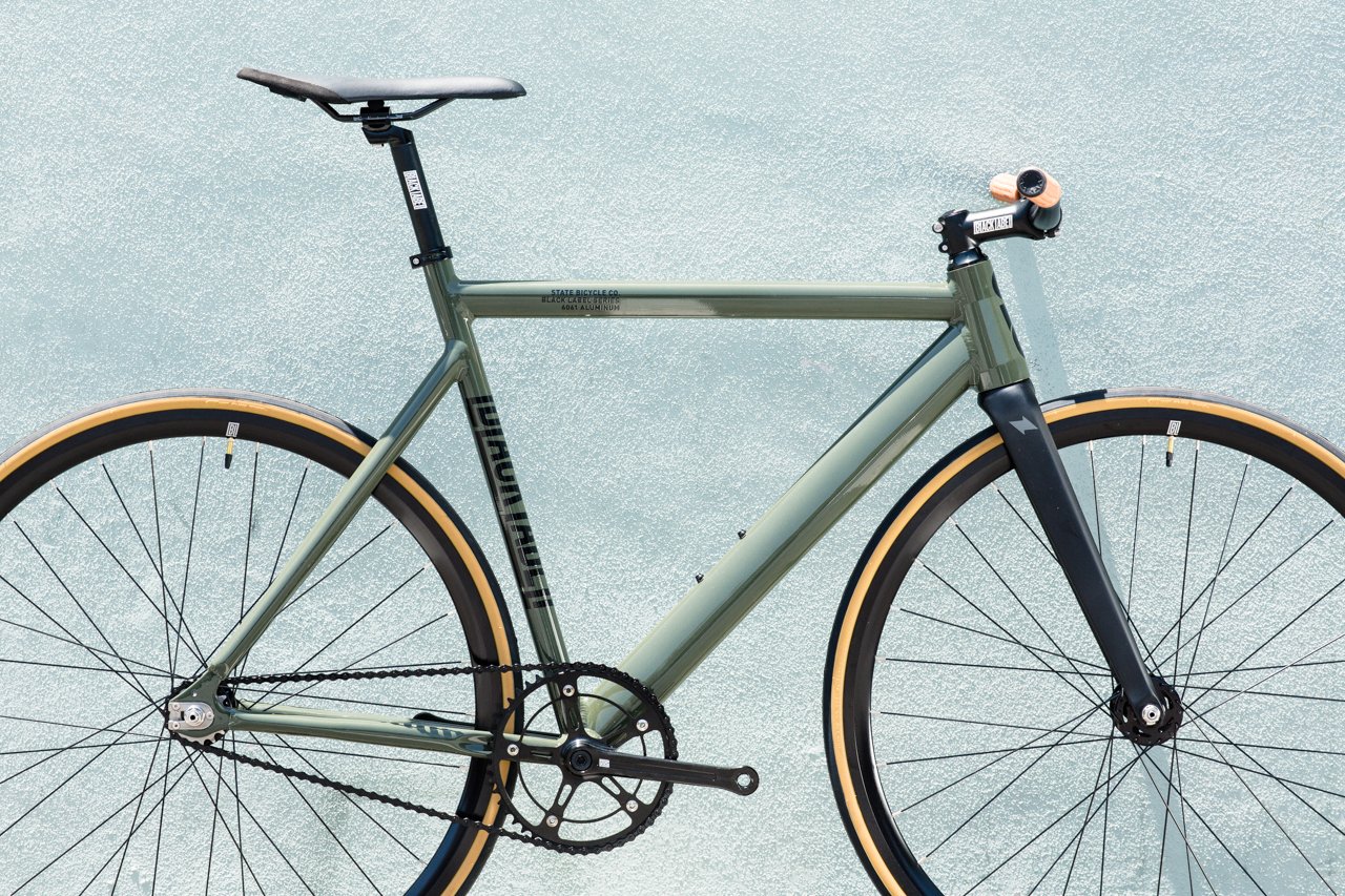 The State Bicycle Co 6061 Black Label Army Green Bike has an abundance of striking new features in comparison to its predecessor and some of the most eye-catching of these include a new Black Label Series CNC’d crank set with 144BCD, lighter Black Label mid-profile wheels with sealed hubs, tapered head tube for a stiffer and more responsive ride and a choice between new Black Label Compact Drops or Wide Risers with Vans Grips.