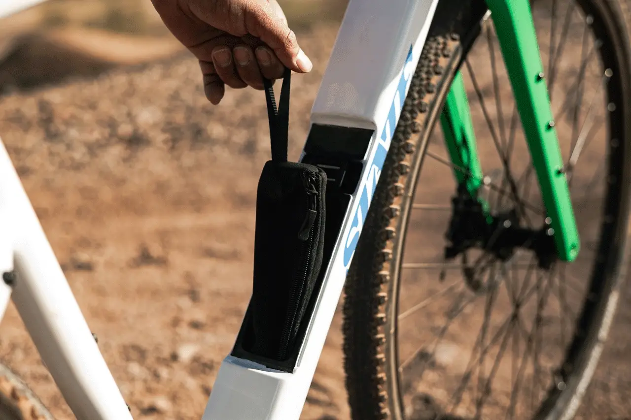 The ingenious “Best of Both Worlds” cable routing system strikes a perfect balance: internally routed cables within the frame and fork provide a clean, aerodynamic aesthetic, while external cockpit access maintains user-friendly adjustability and servicing. A cleverly integrated downtube storage box, featuring a Fidlock magnetic closure and included storage bag, adds practical carrying capacity for essential tools, tubes, or snacks, maintaining the bike’s sleek lines.