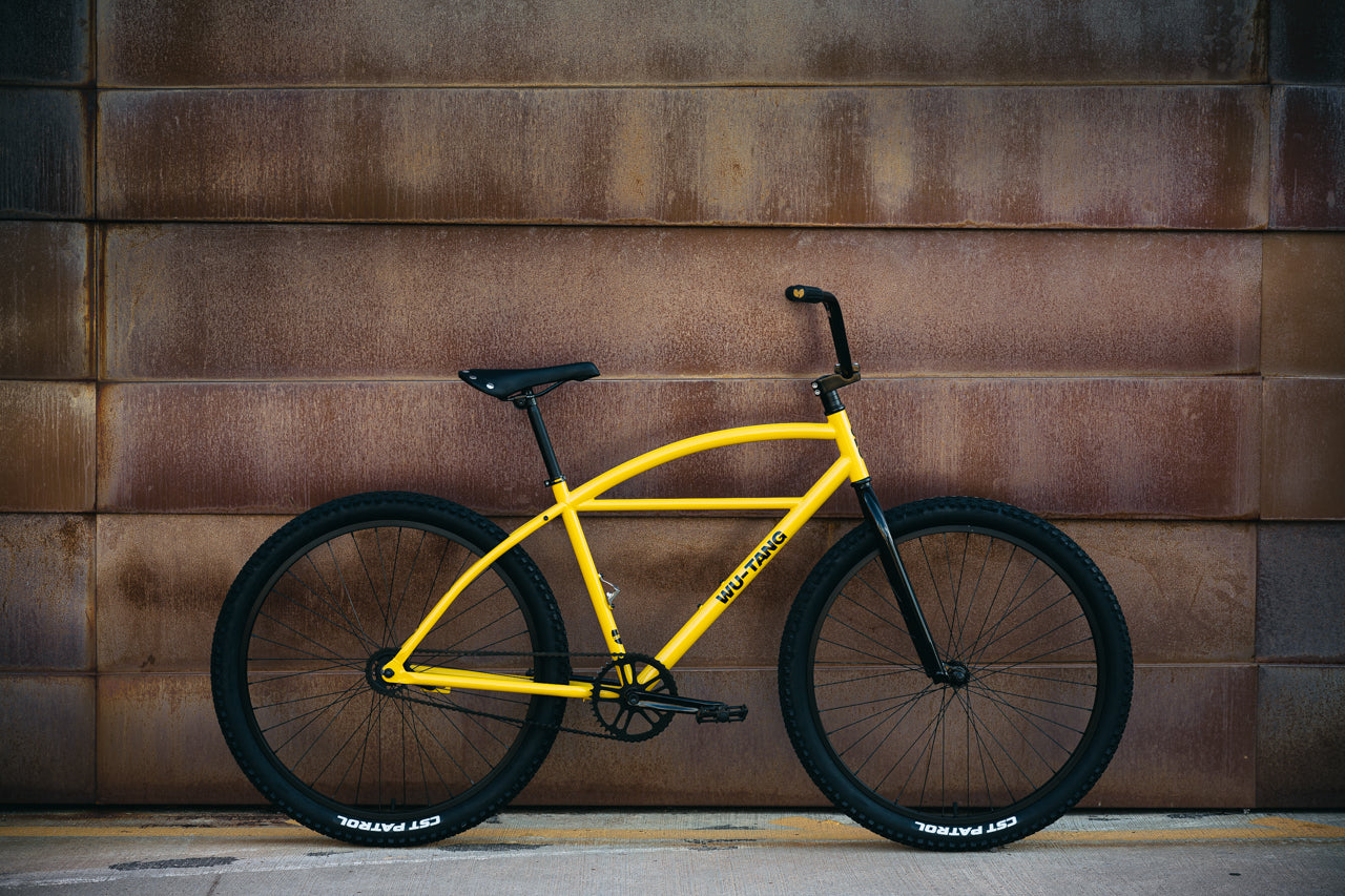 The State Bicycle Co x Wu-Tang Clan Klunker is a beautiful, retro-inspired, mash-up of: part beach cruiser, part mountain bike, and part BMX. The perfect “DGAF” bike, for neighborhood cruises, trips to the corner store, and walking the dog….OR… if you’re feeling audacious, mount up and rip a trail. It has the durable wheels, frame, and handlebars of a BMX bike, with ground-eating mountain bike tires, so mount up and rip a trail if you are feeling audacious. It is the ultimate all-purpose bicycle.