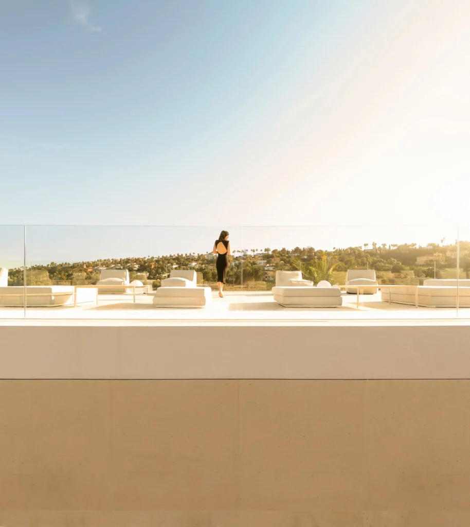 The internal spaces of Villa 95 are logically organised according to these three volumes, creating distinct zones as they ascend the slope. The highest volume is dedicated to the private spaces, housing the bedrooms. These rooms are dramatically lined by an expansive glass wall and are oriented to overlook the large rooftop terrace created by the volume below, onto which they have direct access via sliding glass doors – a seamless blend of indoor privacy with outdoor space and those coveted views. Beneath this expansive terrace sits the central volume, containing the main day areas.