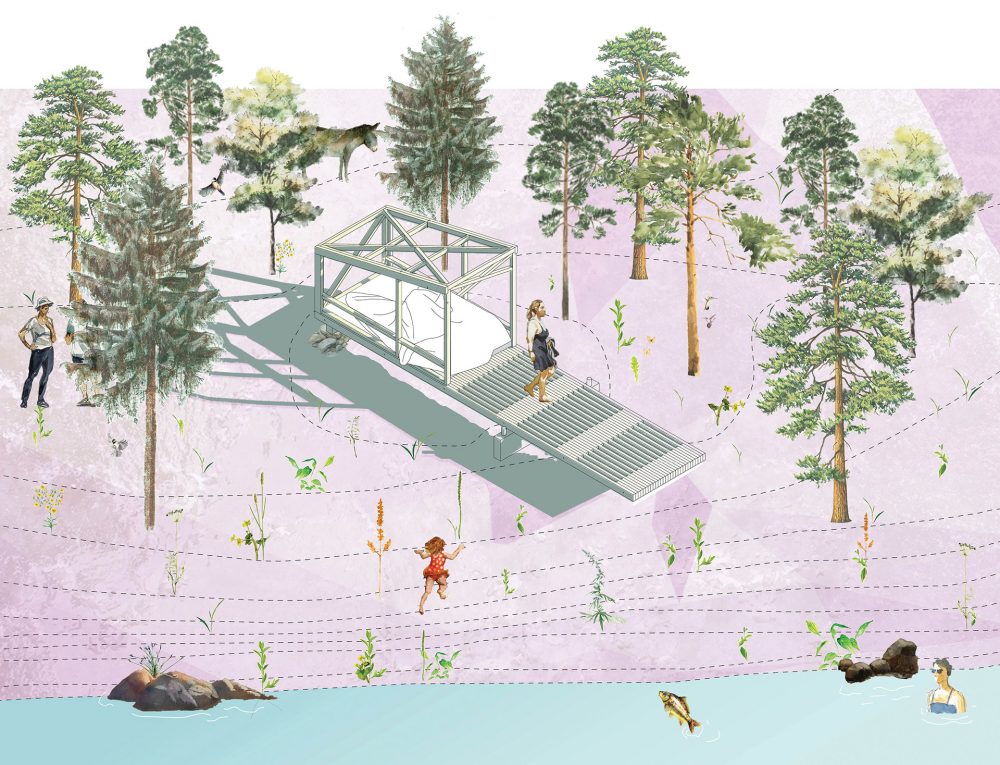 The Dream / Dive Platform from Studio North is stripped down to its bare essentials and has just two fundamental functions – namely, sleeping and play. It boasts a unstated waxed canvas cover which is unrolled over the hut for when the weather takes a turn for the worse which means its a perfect shelter in a down pouring of rain and you can resume your diving fun when the sun comes out again.