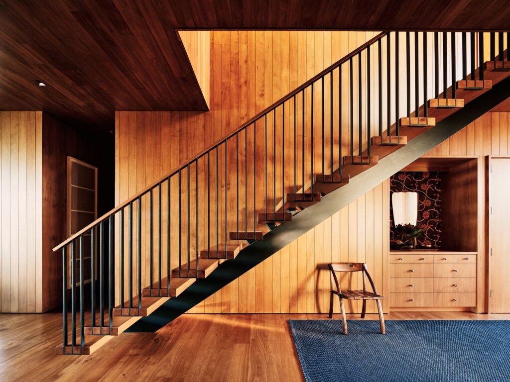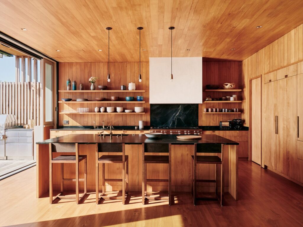 Feldman Architecture collaborated with Evan Shivley of Arborica, a master sawyer specializing in reclaiming and repurposing native Californian timber, to source materials that would resonate with the local environment. Monterey Cypress, chosen for its resilience and natural beauty, became a focal point of the home’s design. The wood, left unfinished, gracefully weathers to a sophisticated grey, providing both exterior and interior cladding that sets a consistent palette throughout the home. The design team minimized waste by holistically integrating various wood grades into the construction, ensuring that every piece found its place in the final product.