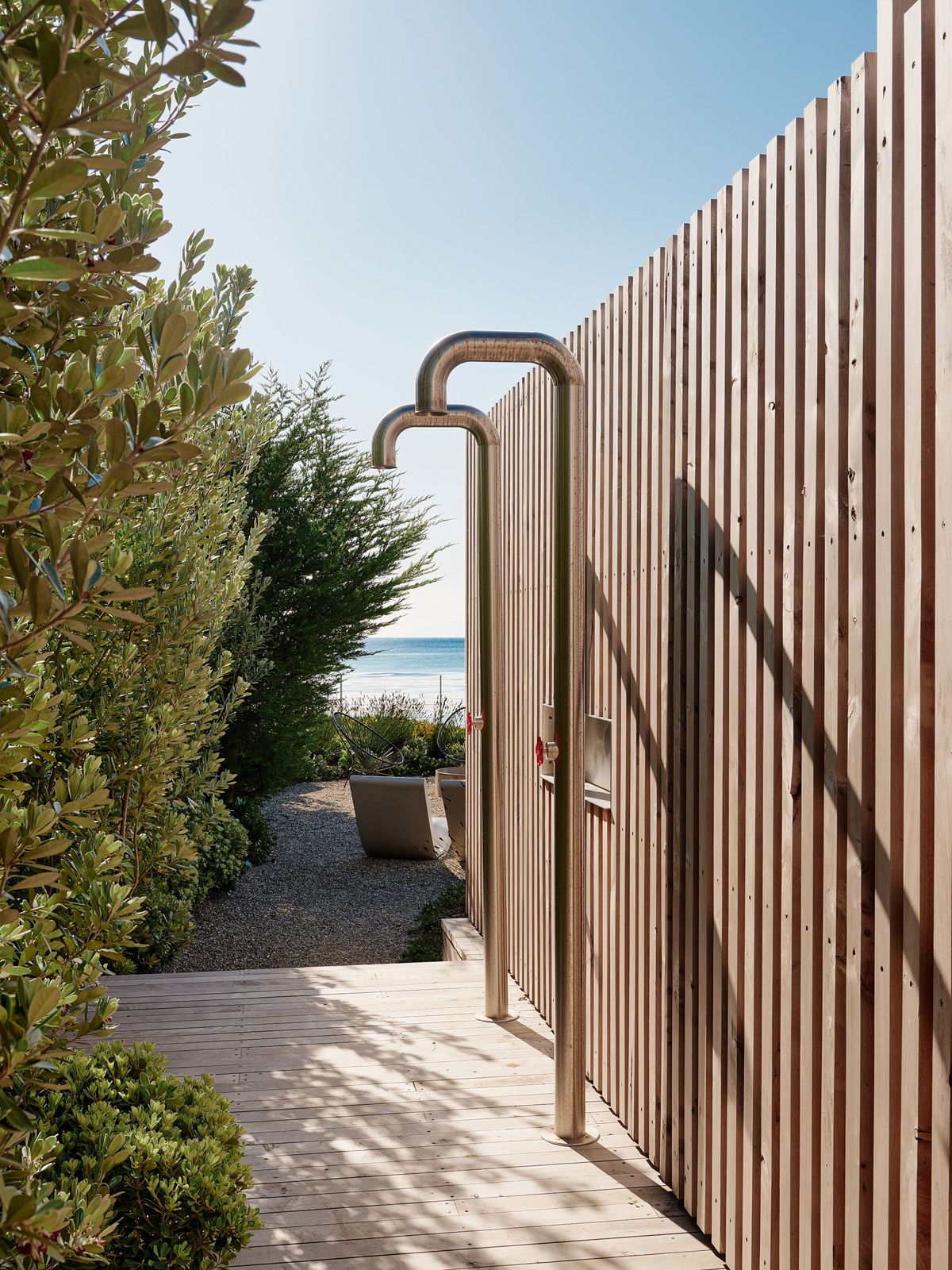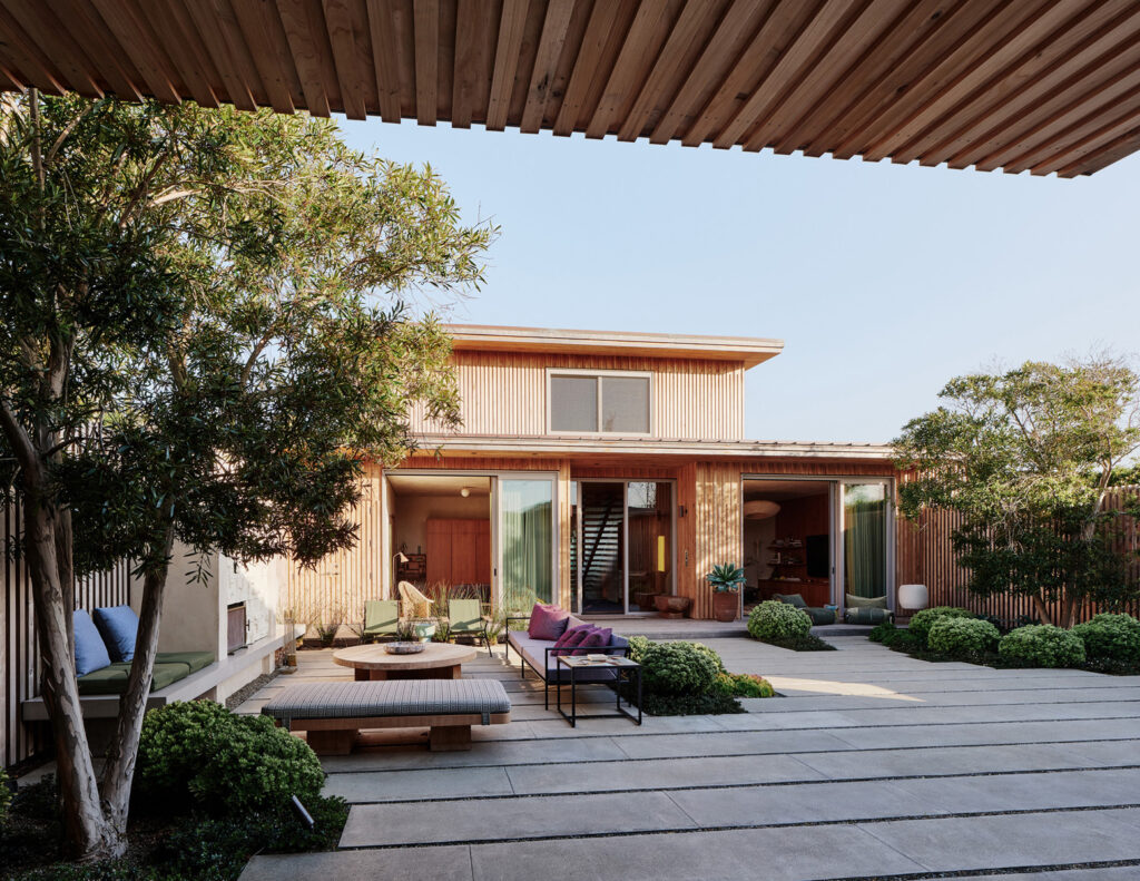 The house itself is designed as a sanctuary from the coastal winds, with the rear yard and deck positioned to take full advantage of the ocean panorama. Meanwhile, the entryway and front courtyard are cleverly tucked behind two separate structures—a customized surfboard storage unit and a garage. These spaces bask in the winter sun, creating a warm, light-filled retreat that remains sheltered from the elements year-round.
