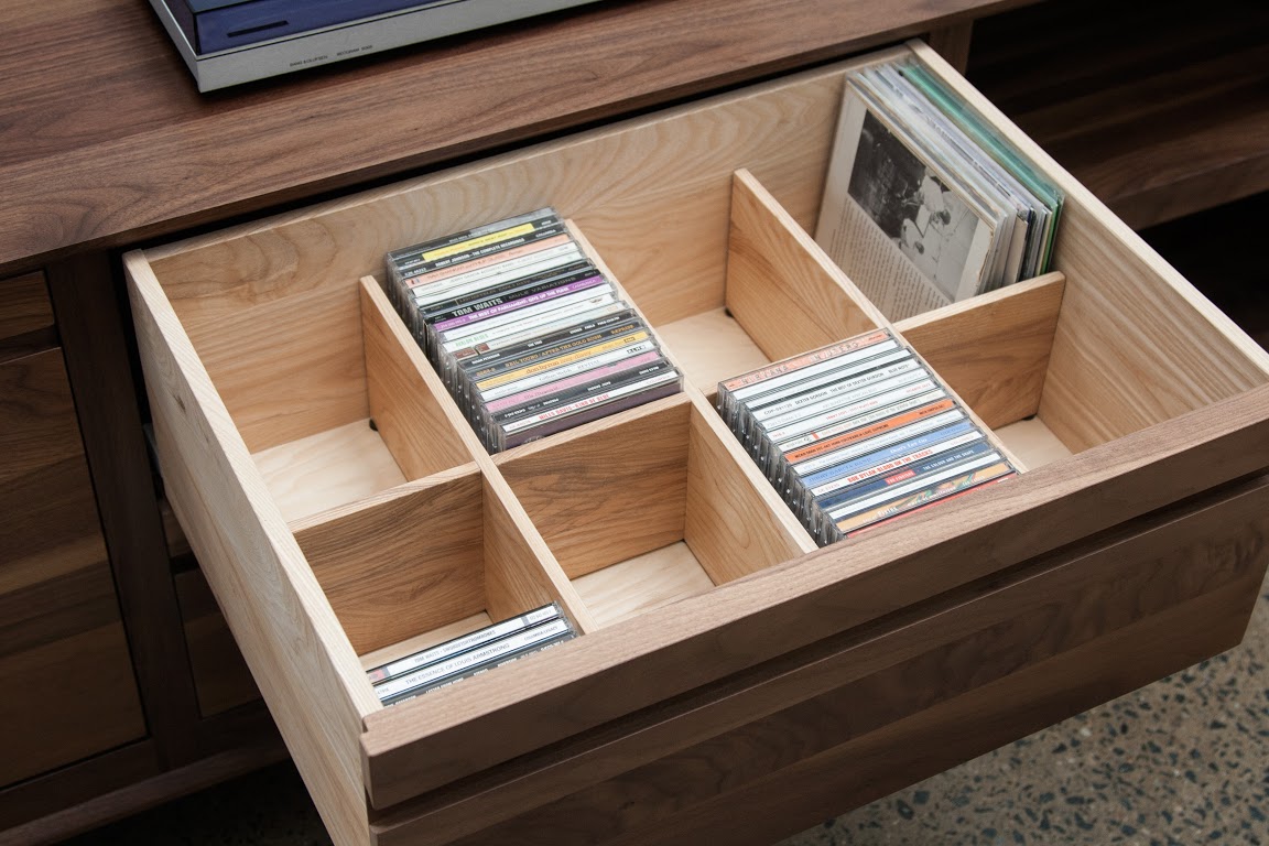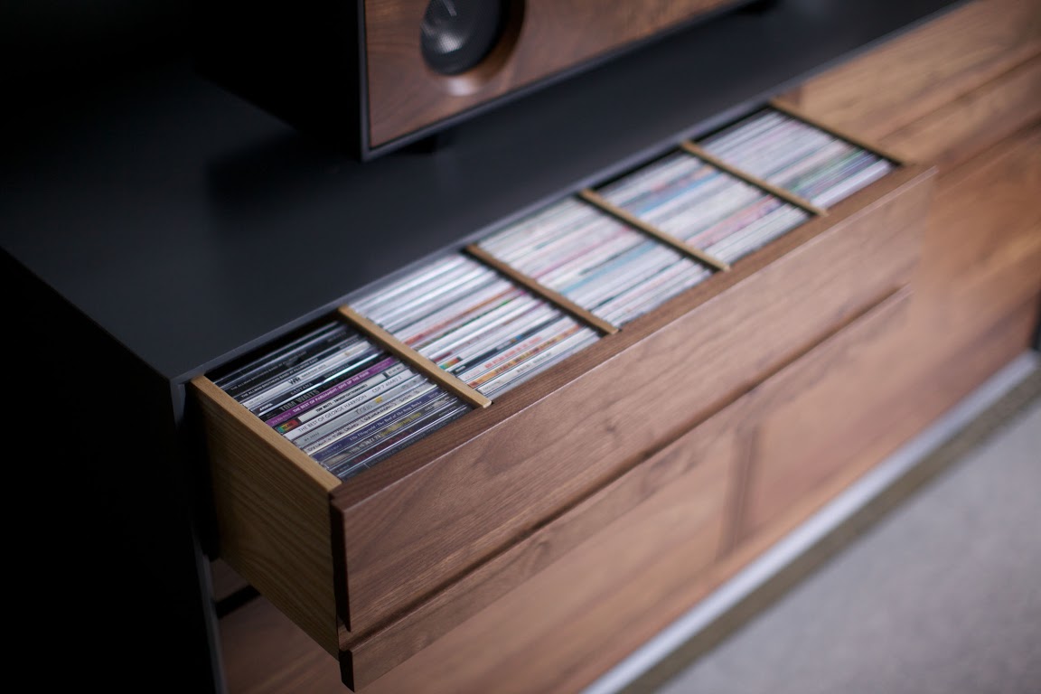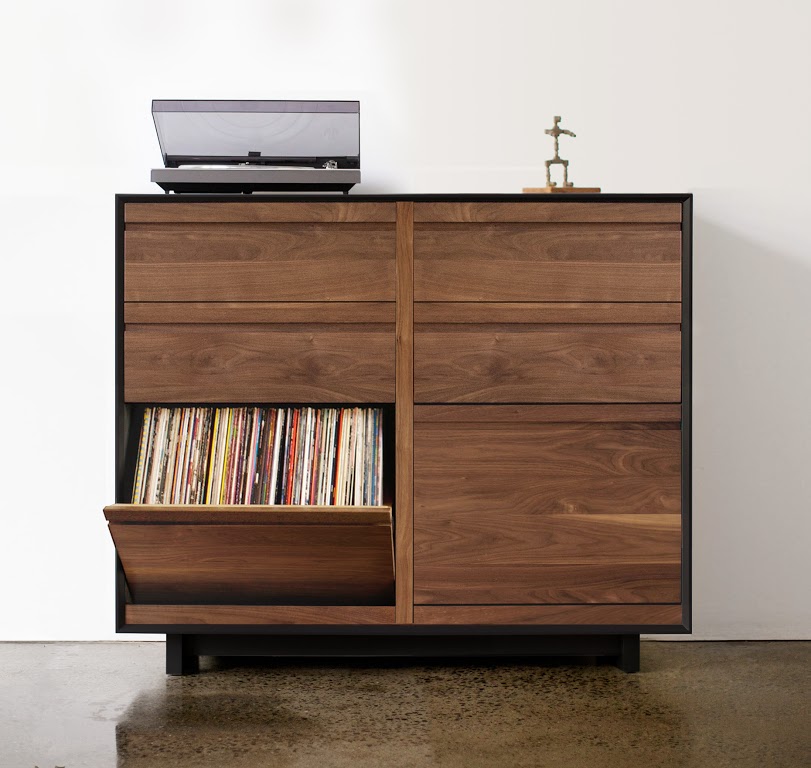 It’s the extensive storage options of the Symbol Audio Aero Cabinet that make it one of the best options on the market for vinyl lovers. The proprietary LP Swivel Bins protect records when closed and display them when open. The dual-pivot hinge balances the weight of the records, even when the bin is full and each bin holds approximately 120 LPs. These bins are joined by the audio rack which are solid wood adjustable shelves that rest on vibration damped 5mm stainless steel pins and provide a firm foundation for your audio equipment. Last but not least, there is the solid wood dovetailed drawer boxes with full extension soft close drawer glides accommodate CDs, DVD/Blu Rays, and even 45s.