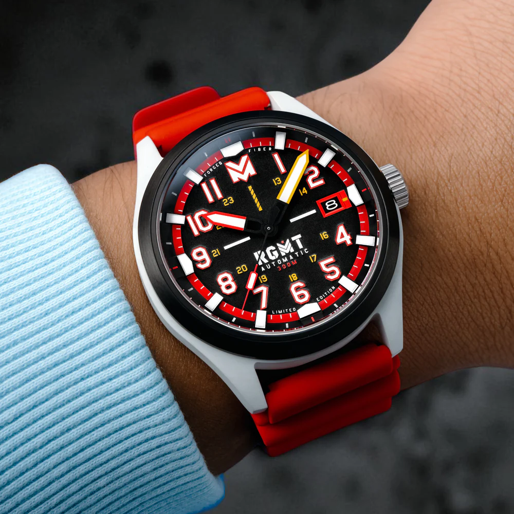 What immediately sets the Defender apart is its groundbreaking case material. Forged from carbon fibre, the 43mm case delivers a one-two punch of exceptional lightness and formidable strength. This is the sort of material you expect in aerospace or high-performance racing, and its application here results in a watch that feels impossibly light on the wrist yet is built to withstand the harshest conditions. But RGMT didn’t stop there.