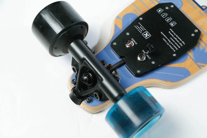 With a sub-£300 price tag, it doesn’t represent too much of a financial outlay for those who want to just start out in the world of electric skateboarding and has some superb features that help ensure its quality performance. It is crafted from 11-Ply Canadian Maple and Carbon Fibre, which gives it a strong robustness but also allowing it to bend and flex like a regular longboard. This design also allows the integrated battery cells to stay protected and bend with the board.