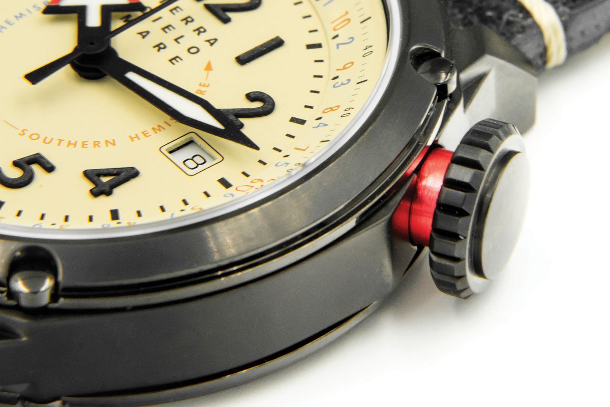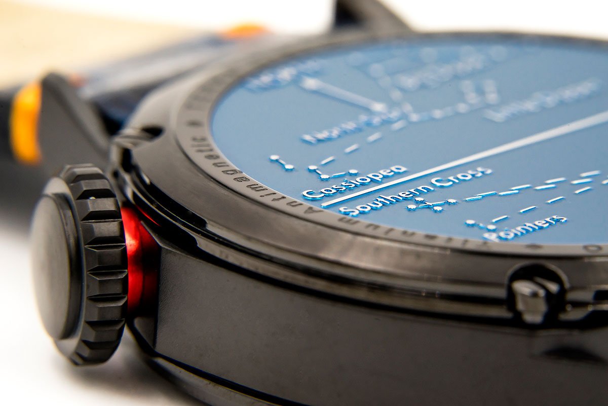 The Terra Cielo Mare Orienteering Watches have one of the coolest case backs you’re likely to encounter. They boast a striking a stellar map which has been implemented so that explorers and adventurers can orient themselves even at night by locating the pole star, in the northern hemisphere, and the south cross, in the southern hemisphere. Another stand out feature of this collection is the crown which is an hour regulating crown that can be placed on the left side of the case at 9h. The timepiece is a left-handed one and the unique design makes it a comfortable watch and will help to avoid articular sprains even in case of fall.