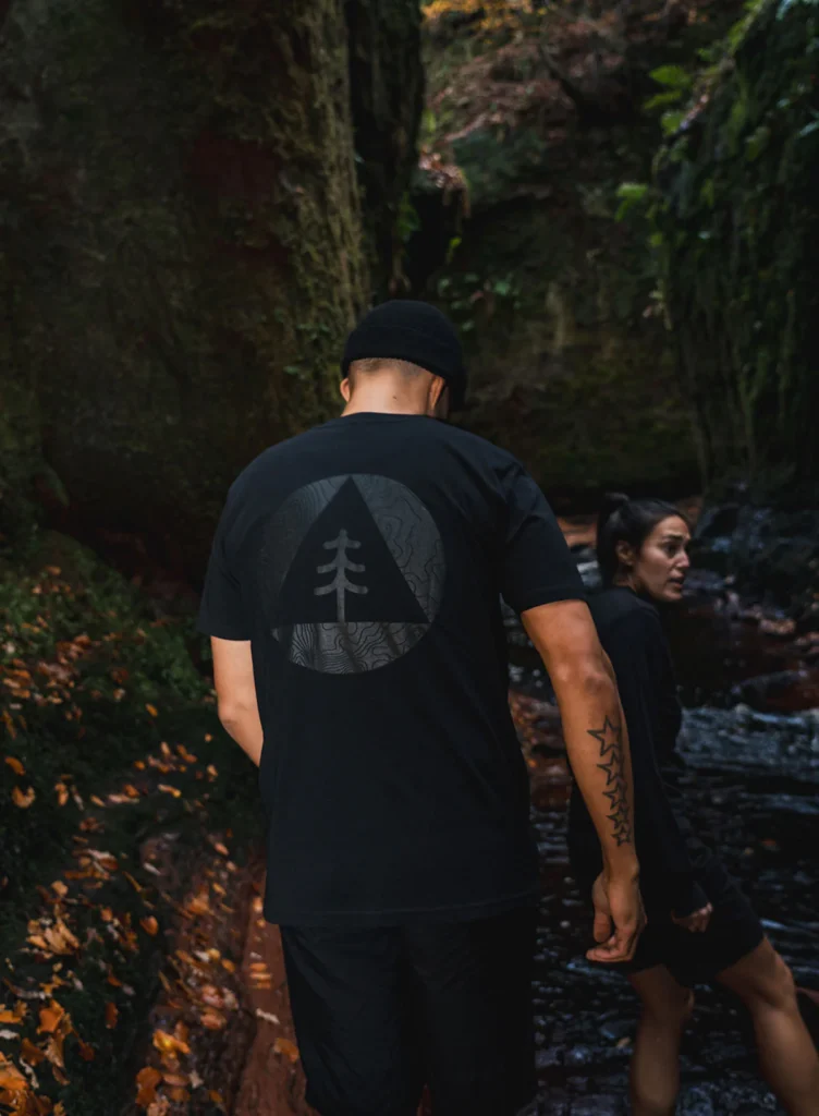 The Mountain Circle Blackout t-shirt is a limited-edition cornerstone of the new Blackout Collection, reimagining the brand’s iconic Mountain Circle design. This piece is profoundly symbolic of Sutsu’s reverence for the natural world. The artwork brings together the crucial elements necessary for existence: the sun, the majesty of mountains, and the brooding beauty of forests.