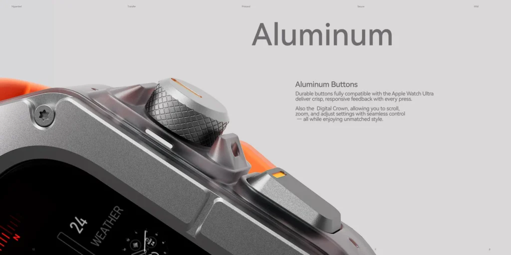 But AULUMA didn’t stop there. The titanium is further enhanced with a Diamond-Like Carbon (DLC) coating, a name that sounds as formidable as its performance. This coating makes the case ten times more scratch-resistant than standard coatings, ensuring it maintains its pristine look long after cheaper alternatives have been marred by daily wear and tear. The robust bottom cover, crafted from durable polycarbonate with a multi-layer spray finish, provides full access to all speakers and sensors, so none of your watch’s functionality is compromised. The custom aluminium buttons are fully compatible, offering that satisfyingly tactile click you expect from a premium product.
