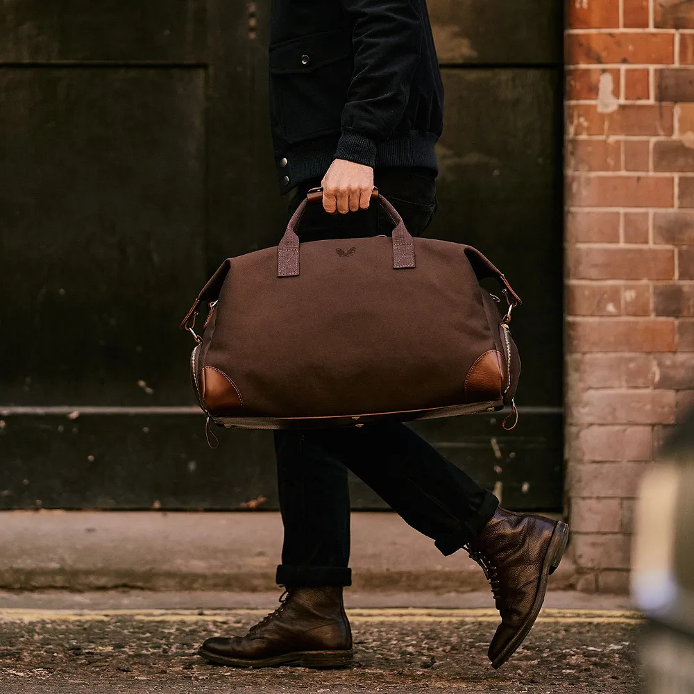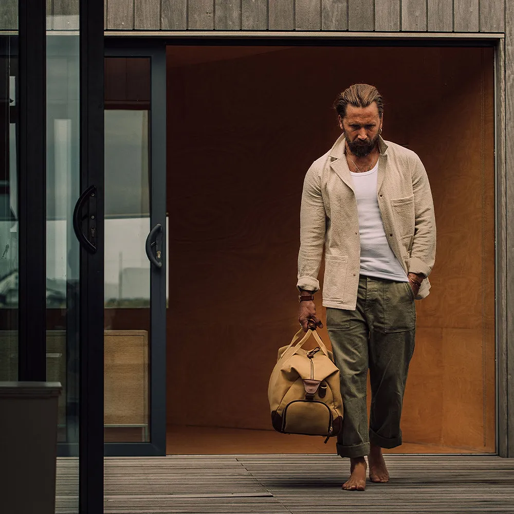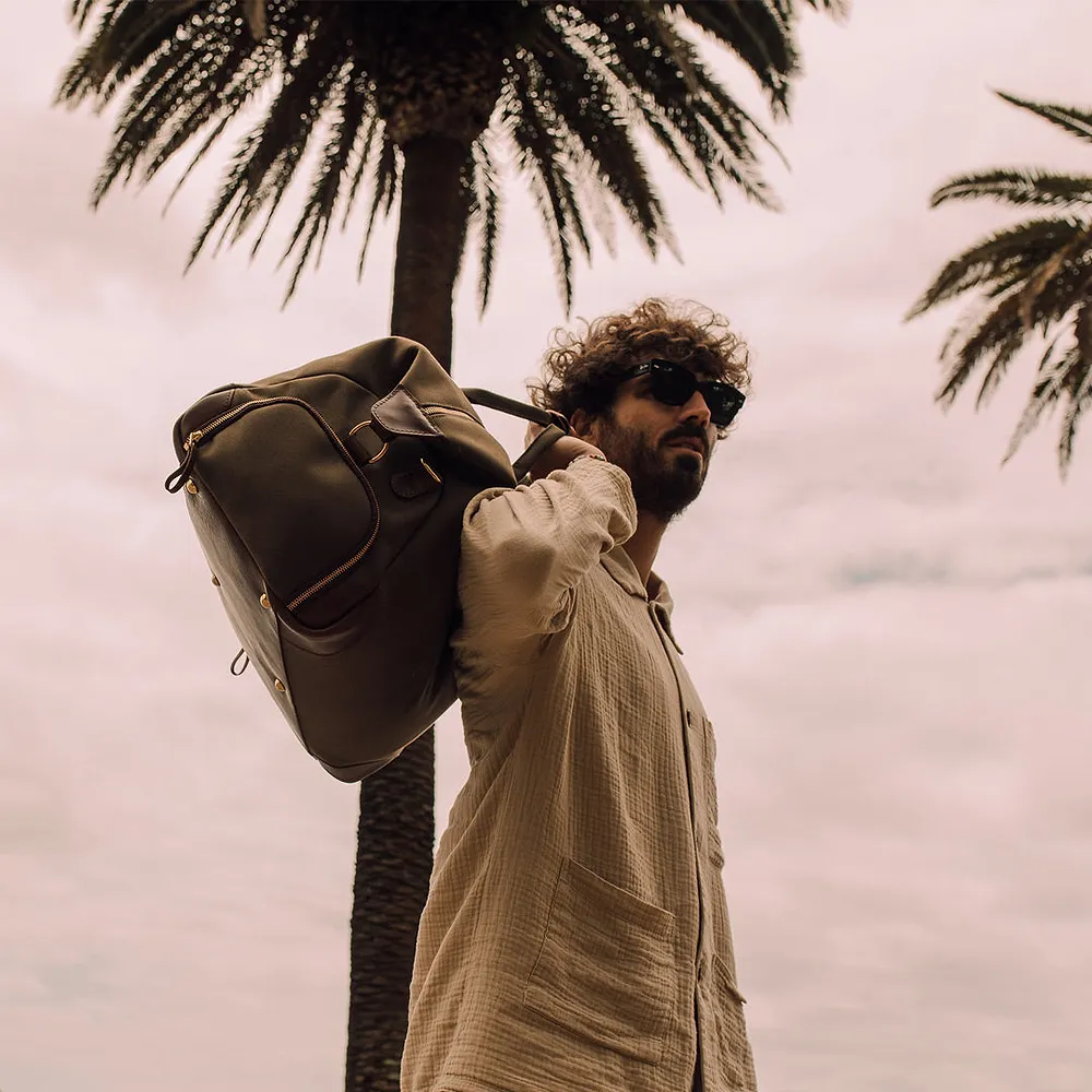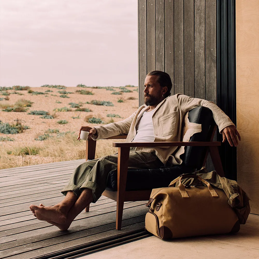Crafted from a robust 24oz British dyed and bonded waterproof cotton canvas, this bag is built to withstand the rigours of travel while exuding an air of understated elegance. Premium full-grain leather graces the trim, handles, and base, adding a touch of timeless luxury and ensuring durability in high-wear areas. The solid brass hardware, welded in London, speaks to the bag’s quality and attention to detail.