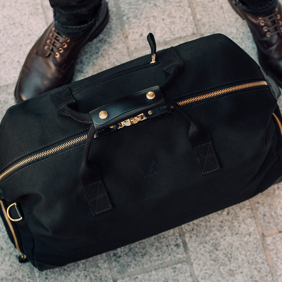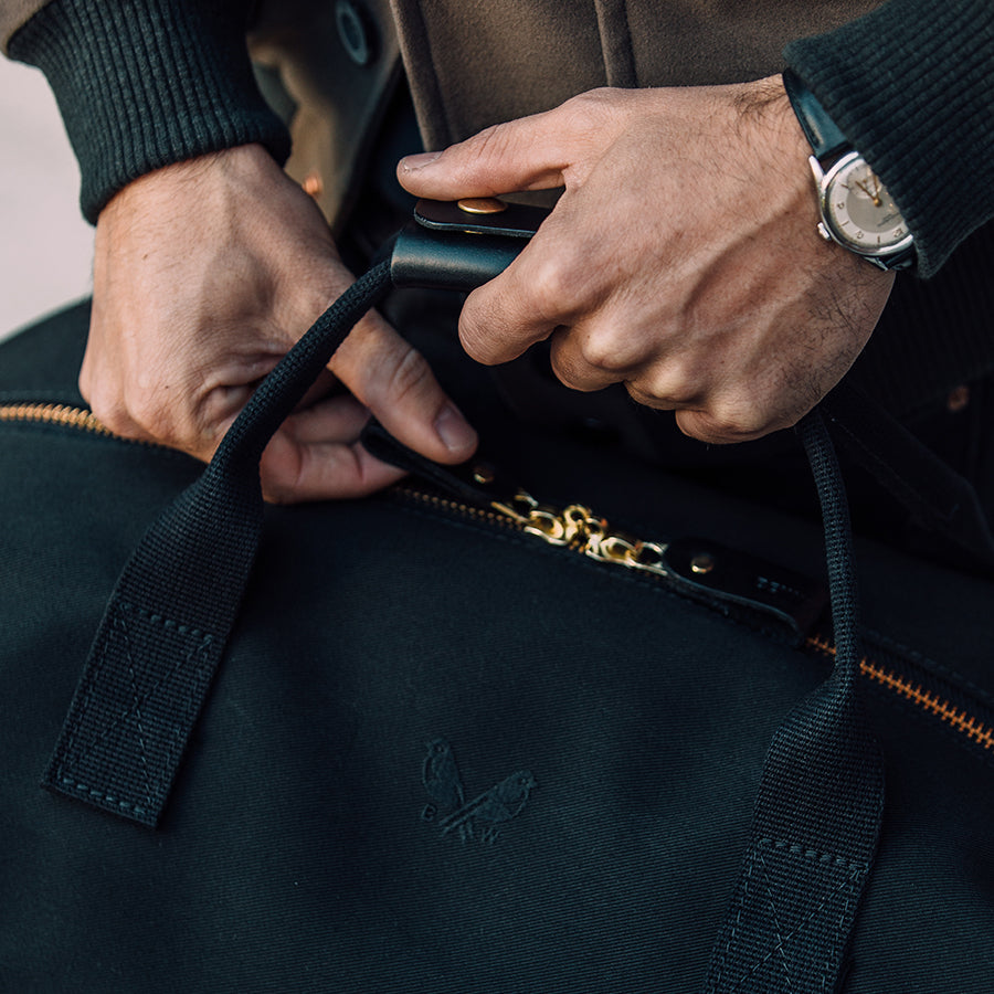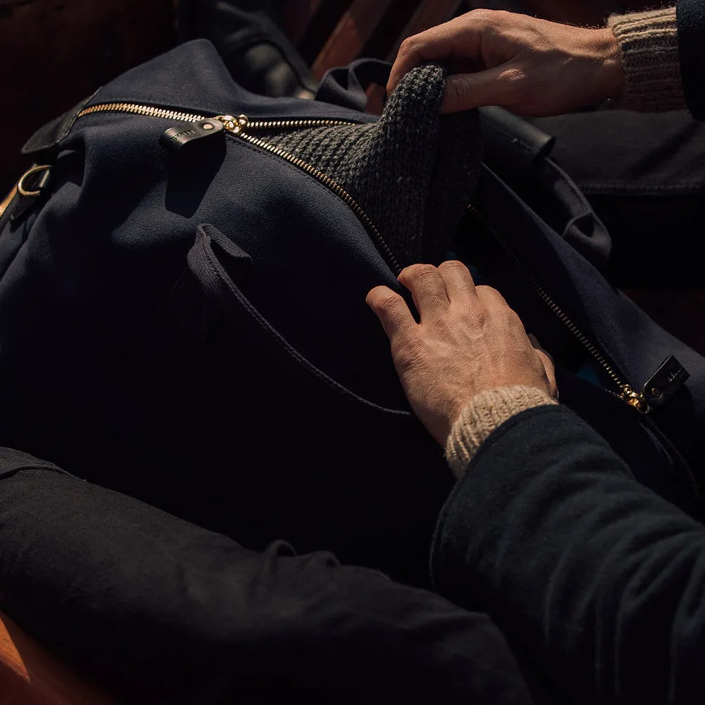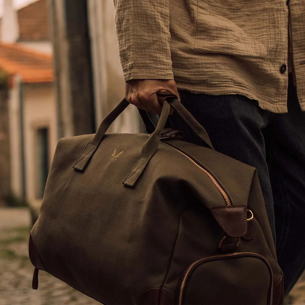 Crafted from a robust 24oz British dyed and bonded waterproof cotton canvas, this bag is built to withstand the rigours of travel while exuding an air of understated elegance. Premium full-grain leather graces the trim, handles, and base, adding a touch of timeless luxury and ensuring durability in high-wear areas. The solid brass hardware, welded in London, speaks to the bag’s quality and attention to detail.