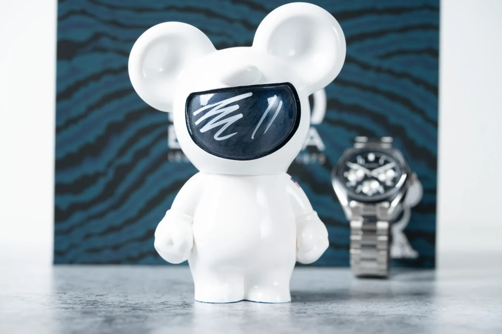 At a price point of $1650, this is a timepiece that offers far more than just timekeeping. It is an experience. The watch is presented on a matching three-link stainless steel bracelet, ensuring it is as comfortable as it is stylish. The individually numbered case back features an engraving of Rosinhole’s whimsical “Budii” figure, a charming artistic signature that further cements the watch’s limited-edition status. This collaboration goes beyond the timepiece itself, arriving in special packaging that includes a storybook and an exclusive 6-inch collectable Budii figurine.
