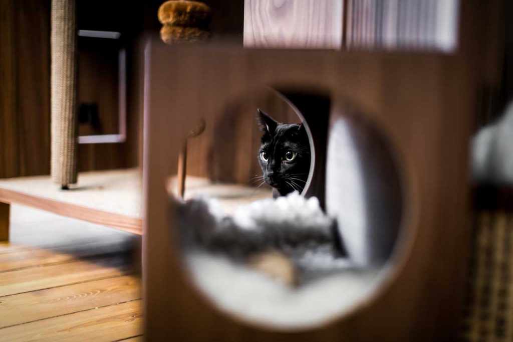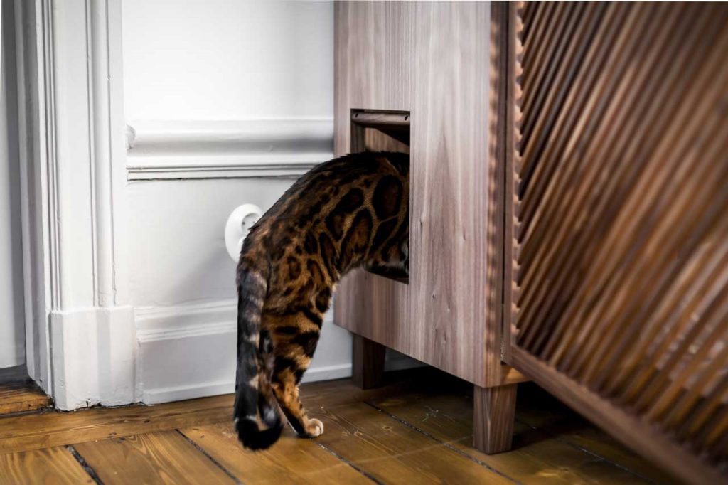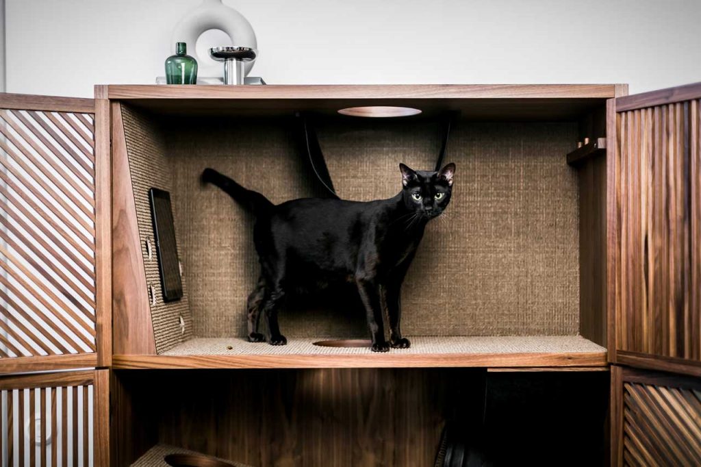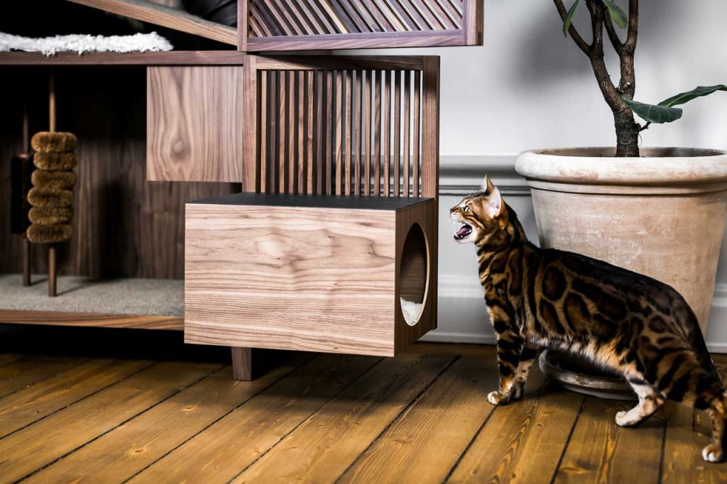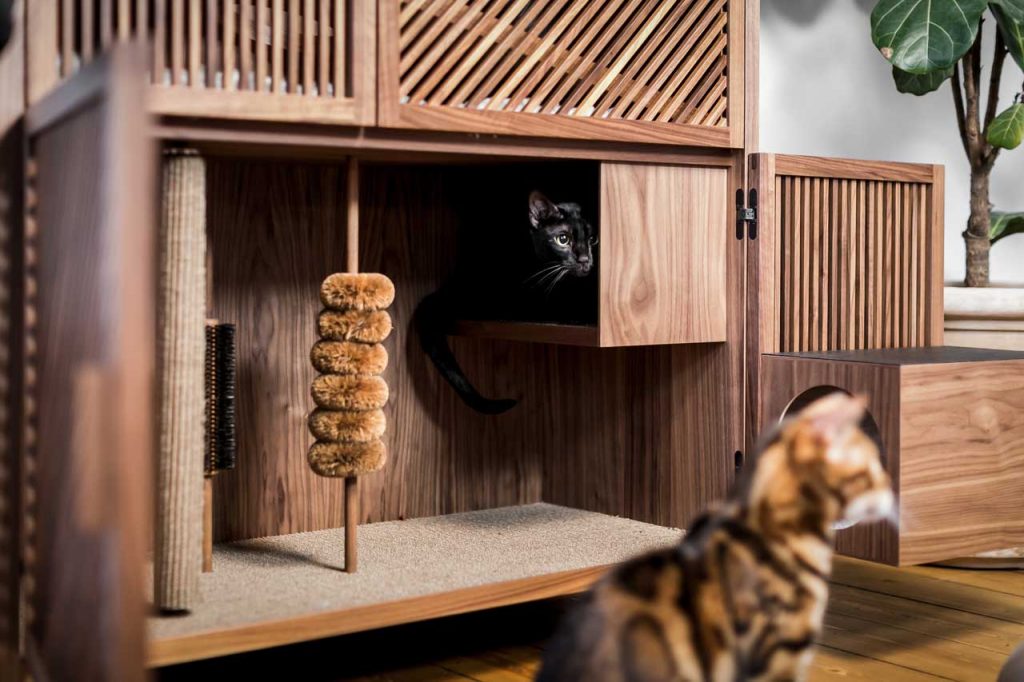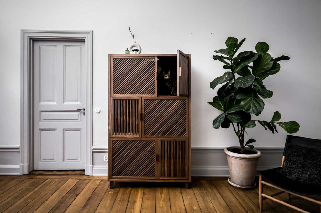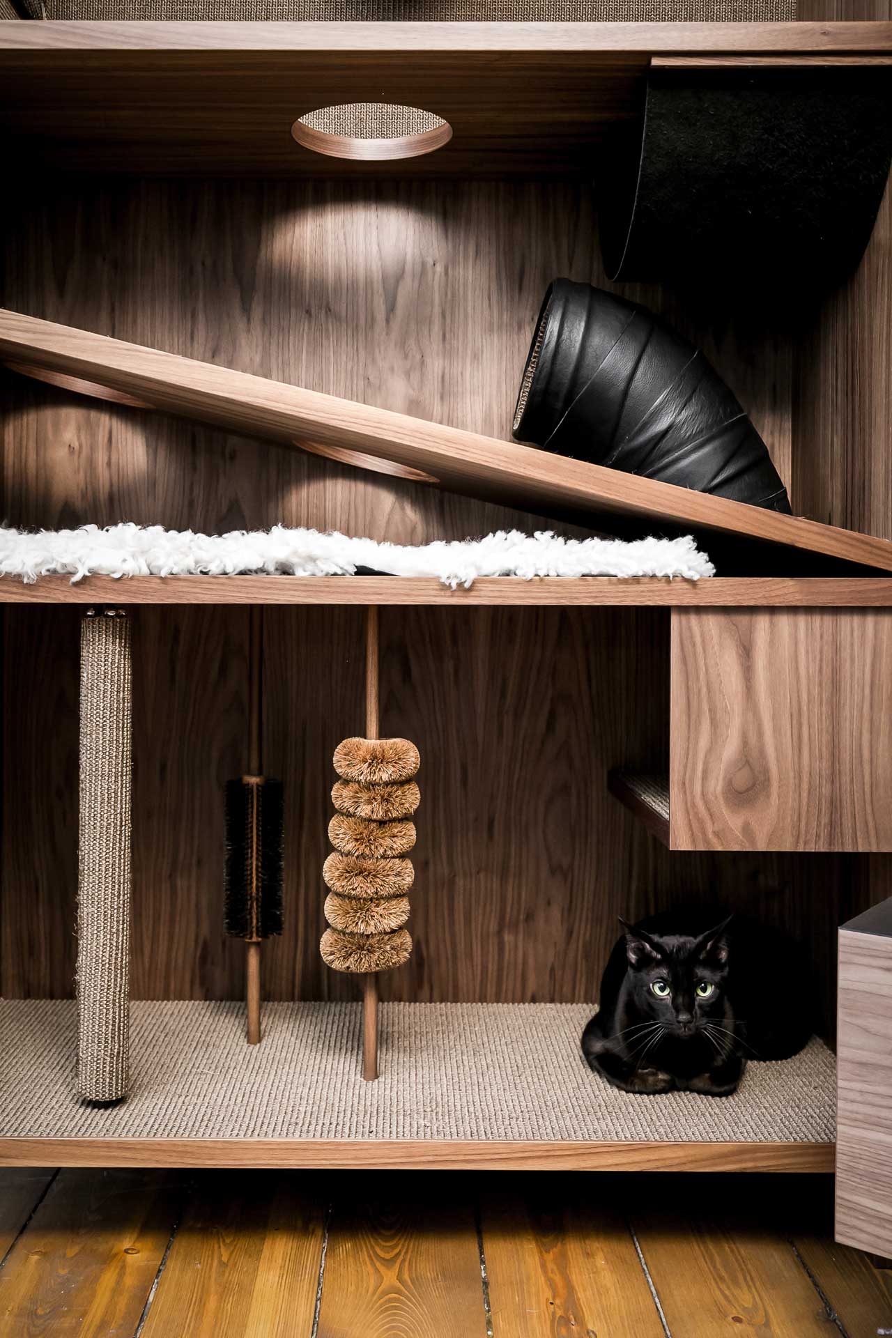 Great to look at, The Cat Flat is crafted from walnut veneer with doors that have vertical and horizontal slats and give the piece plenty of aesthetic character while giving you a shadowy peek of your cats playing within. It stands at three levels, this superb looking cabinet lets cats go wild with the freedom to move throughout the layers and play with the various scratchers and toys that are housed within.