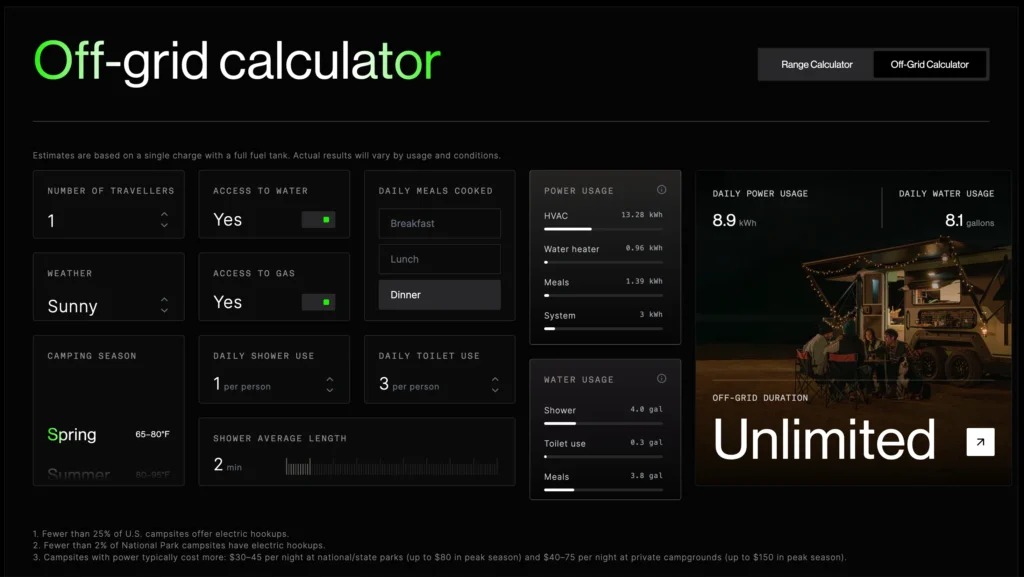 The “Off-Grid Calculator” is another brilliant touch, offering realistic estimates of your power and water limits based on your specific lifestyle, ensuring you are never caught short.
