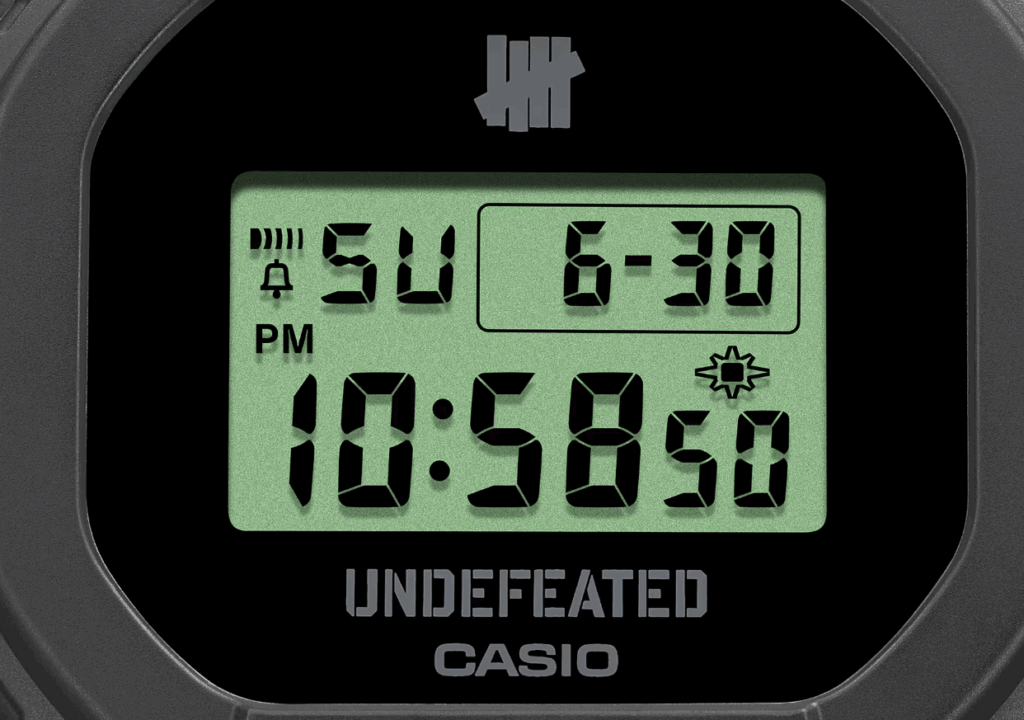 The canvas for this sartorial partnership is the iconic DWE-5600, a G-SHOCK classic renowned for its no-nonsense, robust aesthetic. Here, it gets a masterful Undefeated makeover. The watch boasts a striking green LCD set against a sleek black base, perfectly complemented by a semi-translucent black band that adds a touch of understated flair. For the true aficionados, the Undefeated five-strike logo — their instantly recognisable emblem — makes a subtle yet impactful appearance. You’ll find it proudly gracing both the case back and, rather brilliantly, appearing on the LCD when you activate the backlight. The logo is also discreetly integrated onto the short band strap, while the full brand logo takes its rightful place on the longer strap, ensuring every angle screams authentic collaboration.