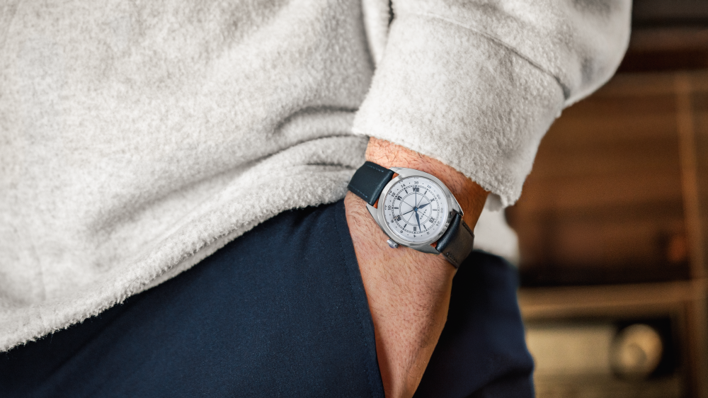 The crosshair sector dial, rendered in glossy enamel and adorned with applied Roman numerals, pays homage to mid-century instrument aesthetics. These utilitarian cues are seamlessly blended with premium details, forging a compelling union of rugged inspiration and dress-watch sophistication.