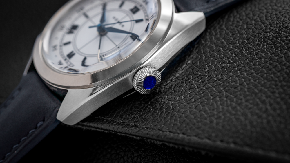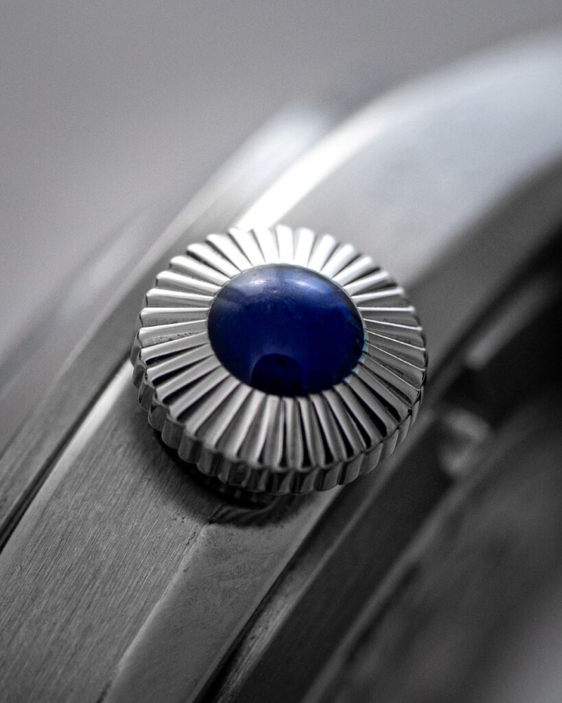 Despite its undeniable air of refinement, the Mirabel’s design subtly nods to classic aviation and military tool watches. The alpha hands, faceted and highly polished (and even heat-blued on the white dial variant), echo the purposeful designs found in pilot’s instruments, albeit with a luxurious twist. The diamond-shaped crown, a direct descendant of early flieger designs, is elevated with a sophisticated cabochon-style insert.