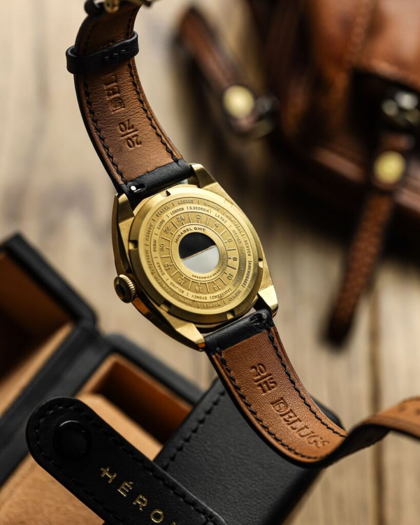 Staying true to Héron’s design philosophy, the Mirabel features a beautifully decorated solid steel caseback. Inspired by Art Deco motifs, it showcases a GMT world timer, with each hour corresponding to a city representing its time zone – a fitting tribute to the golden age of travel. At its centre, an enamel-painted disc elegantly delineates daytime and nighttime on the world timer, adding a vibrant and functional element to the flourished design. Even the interior of the caseback receives a perlage finish, a subtle detail for the watchmaker’s appreciation.