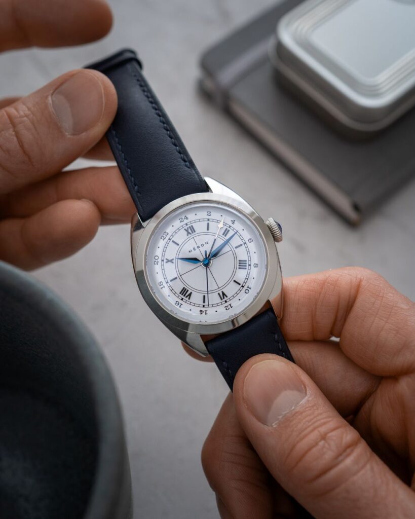 To ensure the Mirabel sat upon the wrist with the grace it deserves, Héron collaborated with the esteemed artisans at Delugs, renowned for their upscale watch accessories. The result is a handcrafted Baranil leather strap, meticulously crafted to Héron’s specifications using supple yet structured calfskin sourced from Tanneries Haas in France. The fine grain of the leather catches the light beautifully, while hand-stitched linen thread and sealed edges ensure longevity. The strap pairs flawlessly with the Mirabel, completing the watch with both exceptional comfort and undeniable refinement.