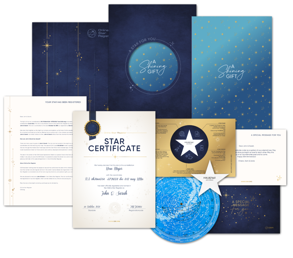 When naming a star in the Online Star Register you can locate your star in the night sky using the OSR Star Finder app. With the app you’ll be able to view information about your star as well as navigate to the location of your star using augmented reality. You can completely personalise your gift, and you can even invite friends and family to sign the guestbook on the special Star Page. Last but not least, the lucky recipient will also receive a completely personalised, theme-based gift pack.