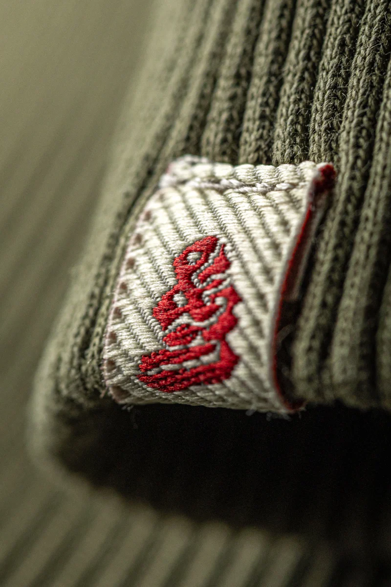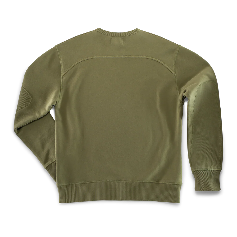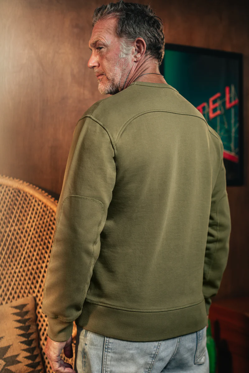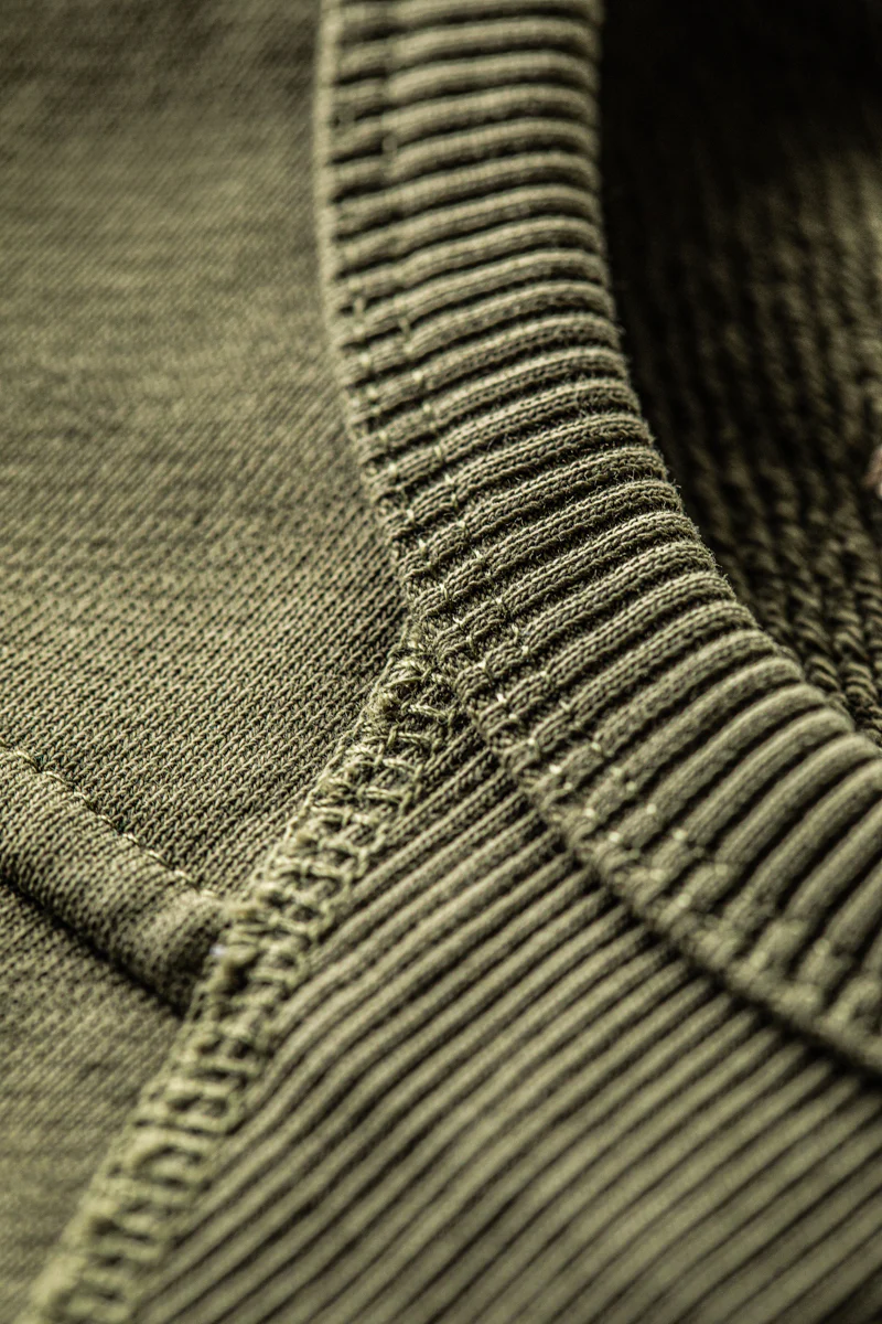 Functionality and form go hand-in-hand here. Curved front and back yoke panels give the piece a structured, flattering shape, while reinforced elbow patches add a touch of rugged durability where it’s needed most—a subtle but brilliant detail that will extend the life of the garment. A ribbed V-insert at the collar adds to both its vintage aesthetic and its practicality, allowing for improved movement and comfort. The 2×2 ribbed neck, cuffs, and hem, along with the back neck rib print and recycled polyester labels, are all testament to a brand that takes every detail seriously.