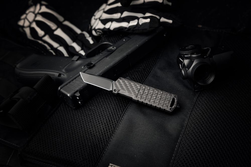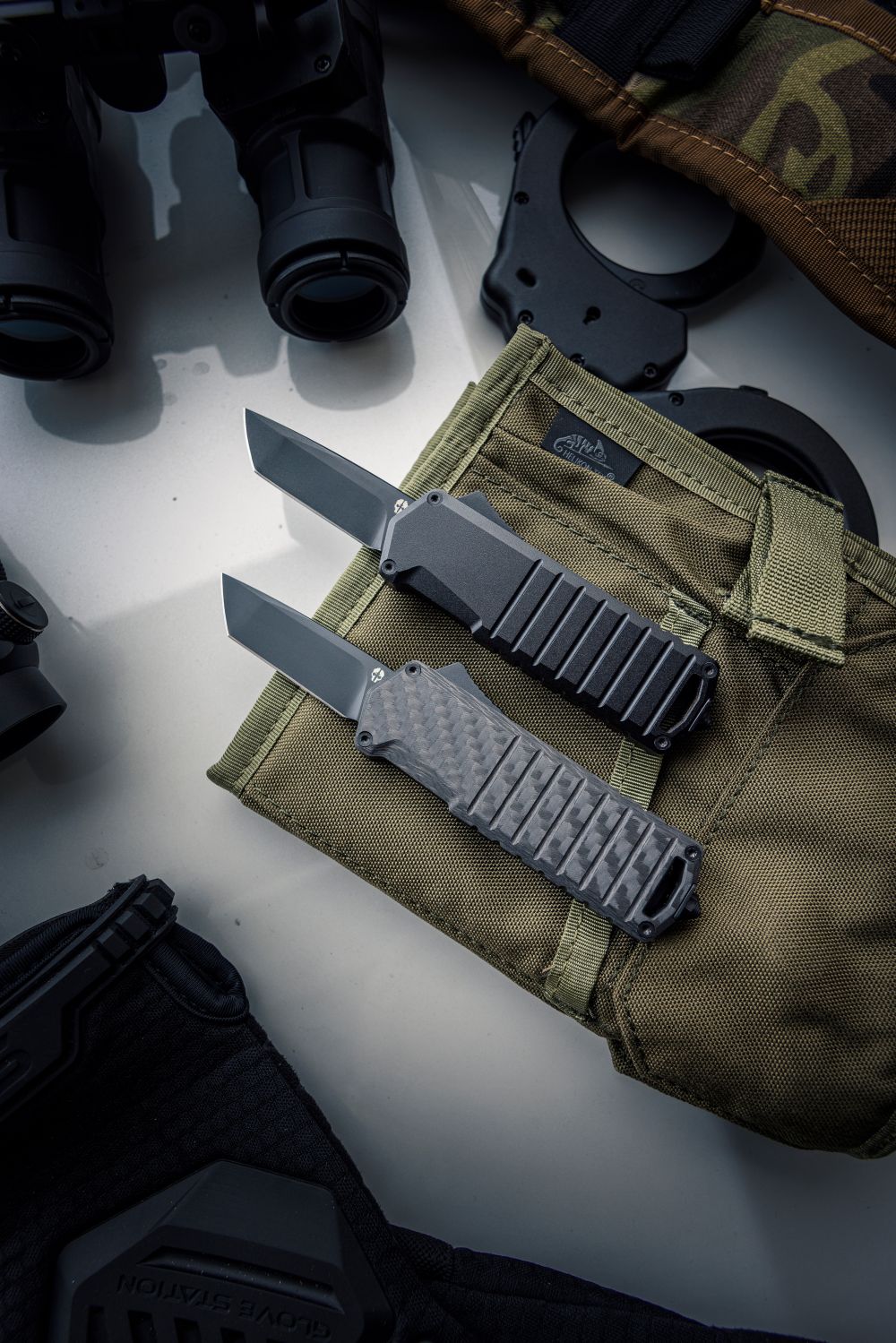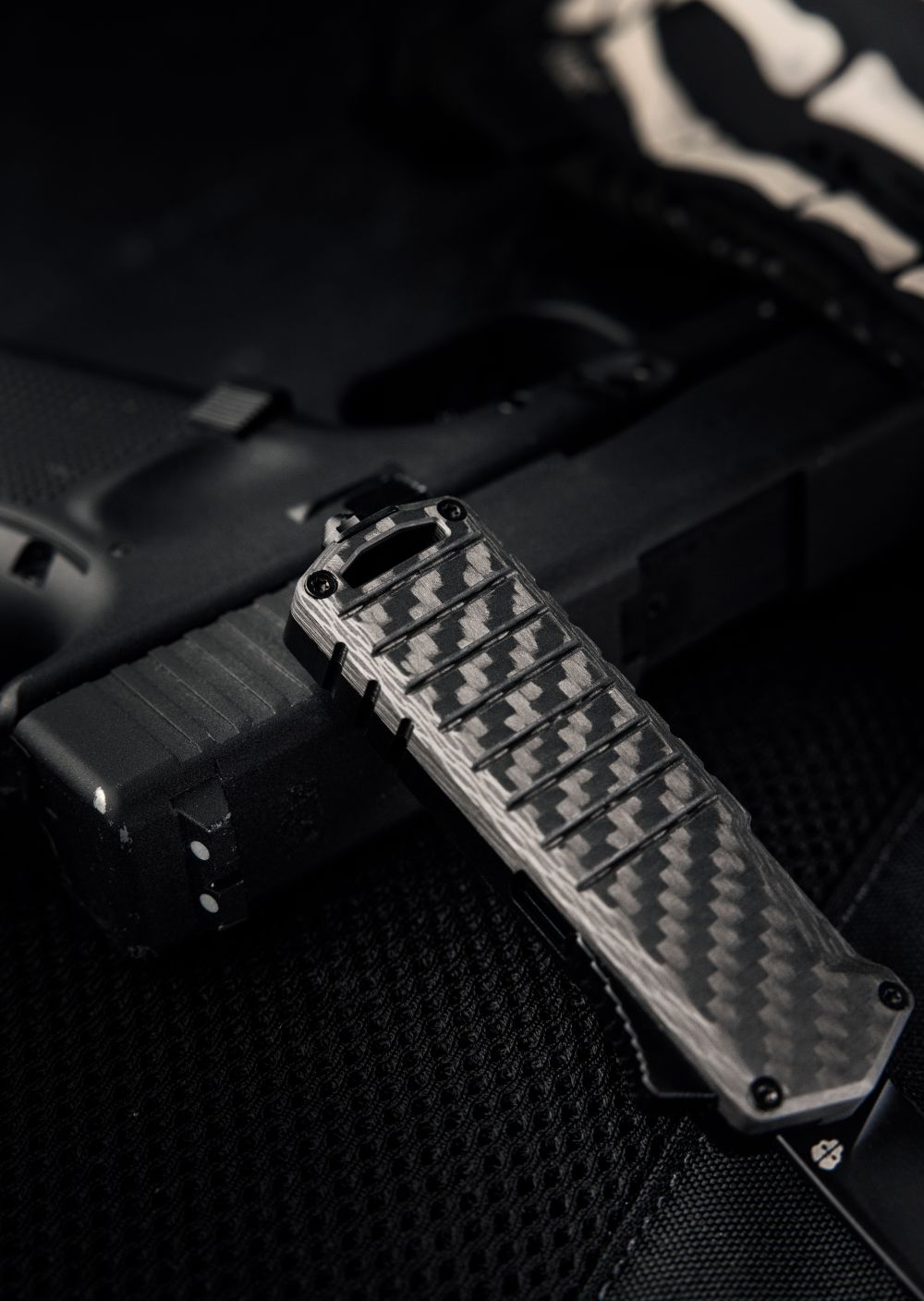 Designed for rapid deployment and unwavering reliability, the A2 Badger OTF (Out-The-Front) is engineered to be an unstoppable force. Its key to success lies in a masterful blend of premium materials and ingenious design. The handle is a compelling fusion of Carbon fibre and robust 6061-T6 aluminium, providing a lightweight yet incredibly durable foundation that feels substantial in the hand without adding unnecessary bulk.