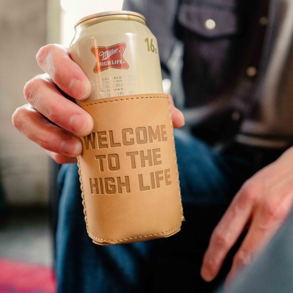 Tie Bar X Miller High Life Leather Beer Koozie | $10