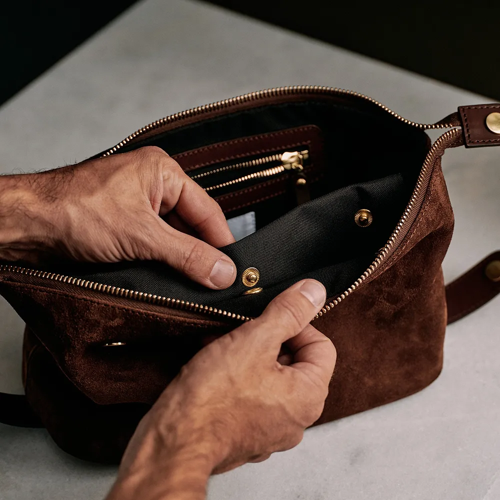 It has that rich, velvety nap and depth of character you expect from fine suede, but it carries none of the anxiety. This bag is built to withstand the inevitable spills and splashes of a hotel bathroom, developing a unique patina over time without sacrificing its integrity.