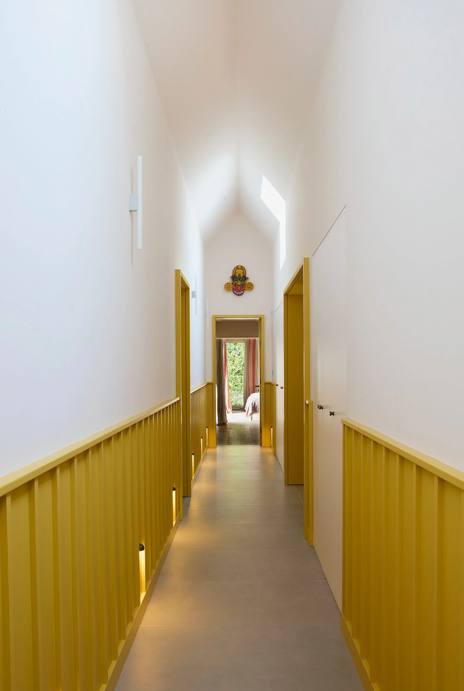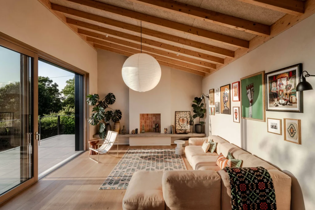 For the interior palette, Forgeworks collaborated closely with McCarthy, infusing playful pops of pinks, yellows, and greens into the corridor and bedrooms. This vibrant touch provides a delightful contrast to the more muted, serene finishes found in the living areas, which feature a sophisticated combination of lime-plastered walls and exposed spruce beams, creating an inviting and harmonious living space throughout.