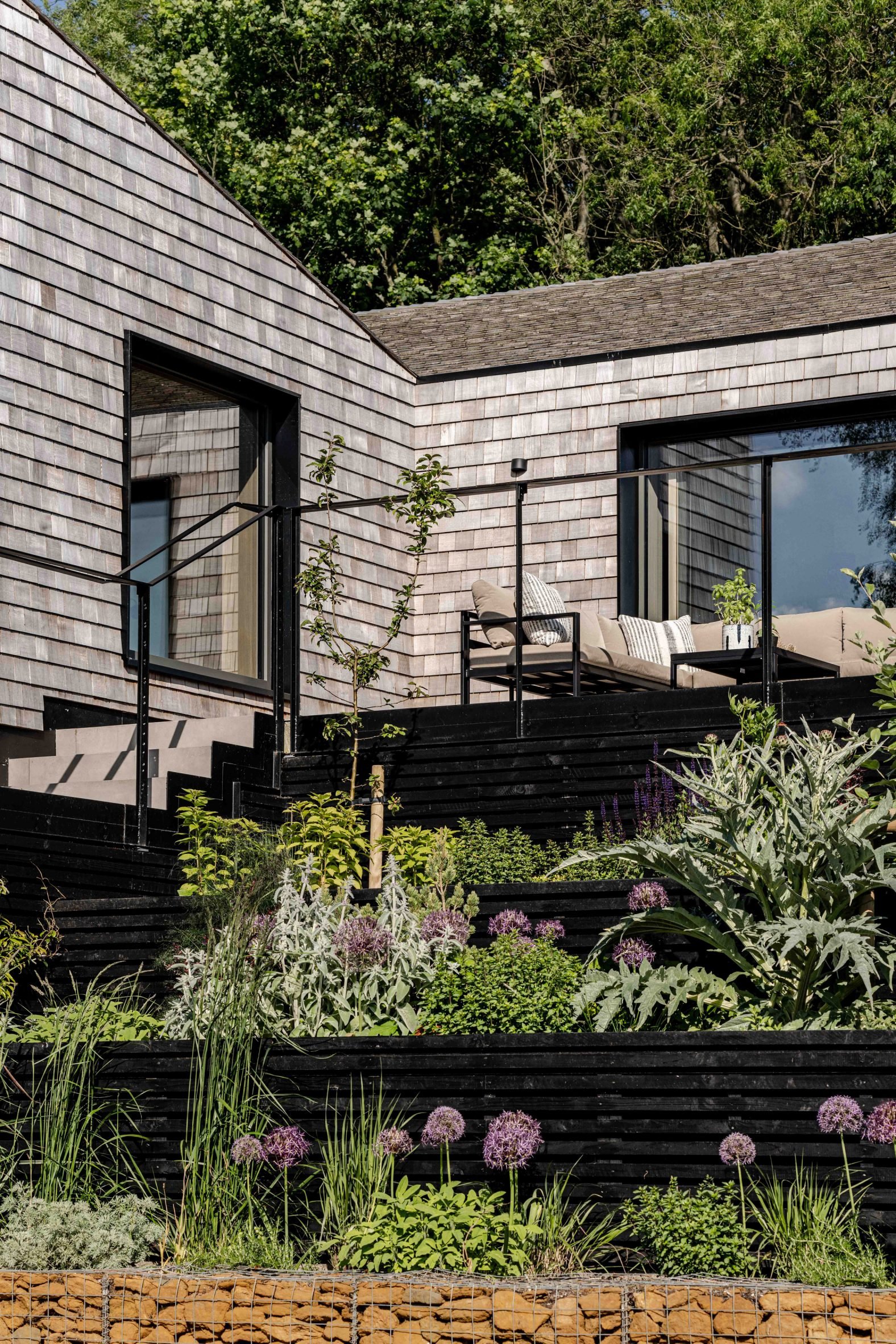 This volume dramatically opens up, strategically positioned to frame and embrace the breathtaking views across the rolling landscape. All of these west-facing areas spill out onto a multi-tiered terrace, gracefully stepping down the hillside and seamlessly blending comfortable seating zones with areas of verdant planting – perfect for those long, contemplative evenings.
