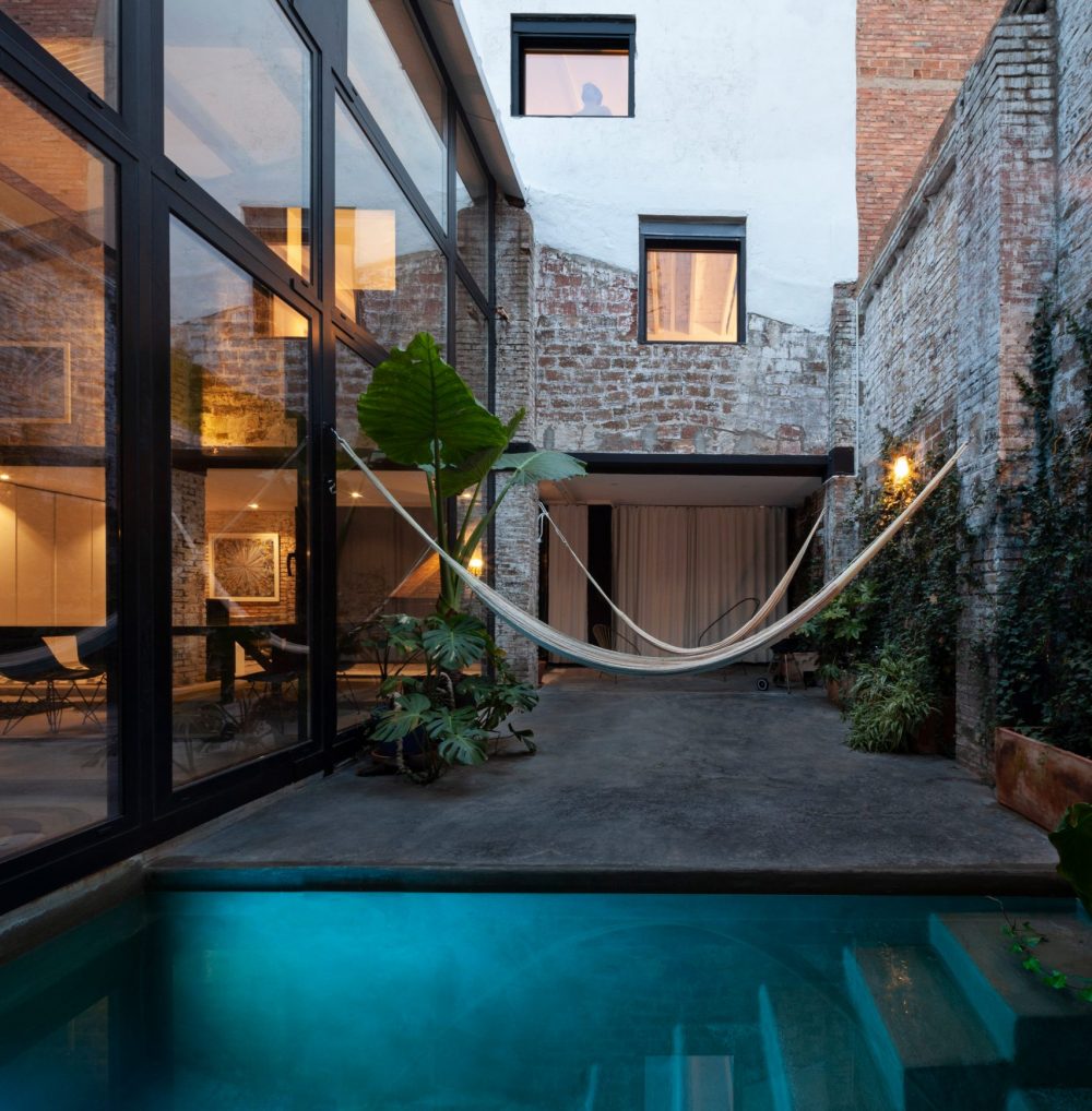Black is certainly the dominant colour in The Theatre House and though this might not work with every style of home, it delivers exactly the right sort of aesthetic for this reimagining of an older structure. One of the living spaces has black-framed windows and glazed swing doors, which look through to an outdoor patio where the owners can relax and unwind away from the hustle and bustle of central Barcelona.