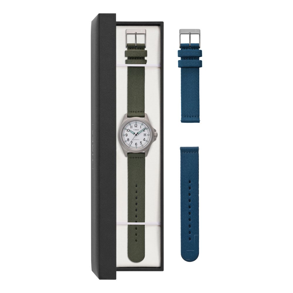It also has an exhibition caseback with the Huckberry logo, a 44-hour power reserve, and a hand-winding operation that gives it a pleasing tactile performance. The matte white dial features printed Arabic markers and has ultra-bright C3 Swiss SuperLuminova luminous paint on the hands and dial indices. It also comes with two interchangeable TIDE nylon straps, made from upcycled ocean-bound plastic. The straps are blue and olive drab green, and they both have a titanium pin buckle. Grab yours now.
