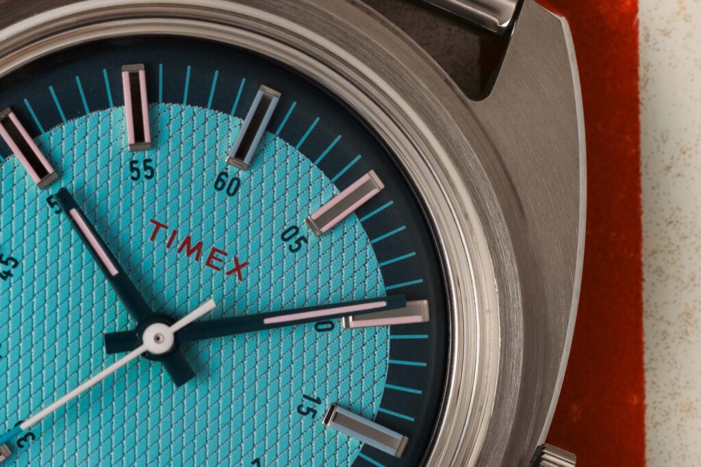 The Timex x Worn & Wound WW75 V2 maintains the same dimensions as its predecessor, with a 37mm x 43mm case. Its height, including the domed acrylic crystal, measures 12.7mm, while the lug width is 20mm. Designed for versatility, the watch is well-proportioned and complements a range of wrist sizes. The dials showcase an intriguing play of colours and textures arranged in concentric circles. The central area exhibits a distinctive waffle texture, surrounded by a contrasting coloured ring that adds a vibrant touch. Applied indices elegantly bridge the two zones, fostering a seamless visual flow. Additionally, a rotating set of numerals for the minutes/seconds adds a touch of casual flair.