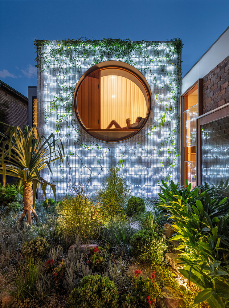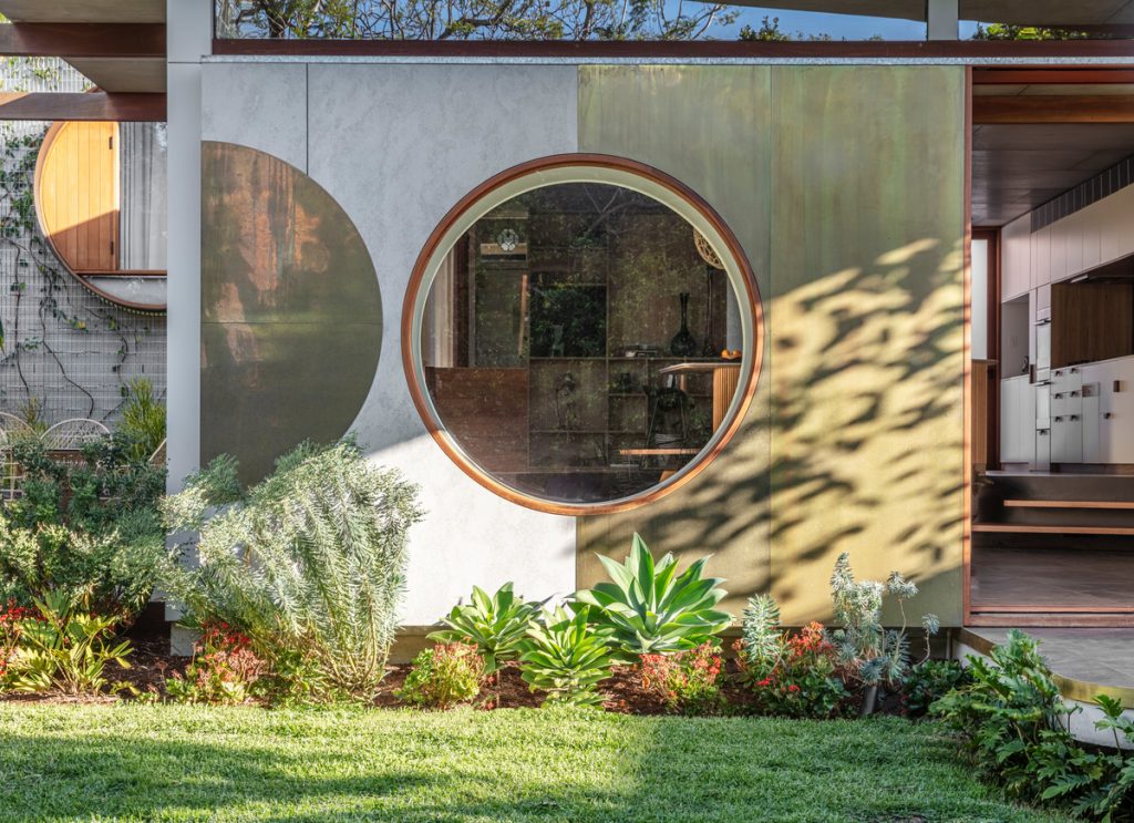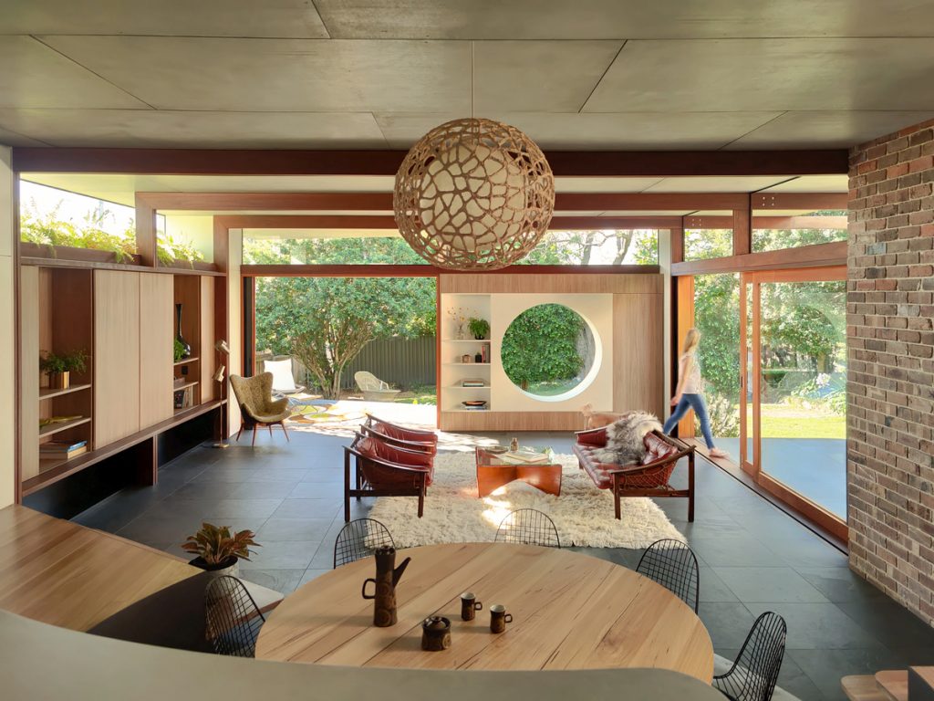 The new design adds in a stunning, large circular window that frames the view of the outdoor living space and backyard and takes its inspiration from the Japanese concept of Shakkei. The frame itself also serves as a comfortable seating space for the family’s young children. The room is fitted with two layers of blinds, both solid and translucent, to allow for maximum control of privacy and natural light.