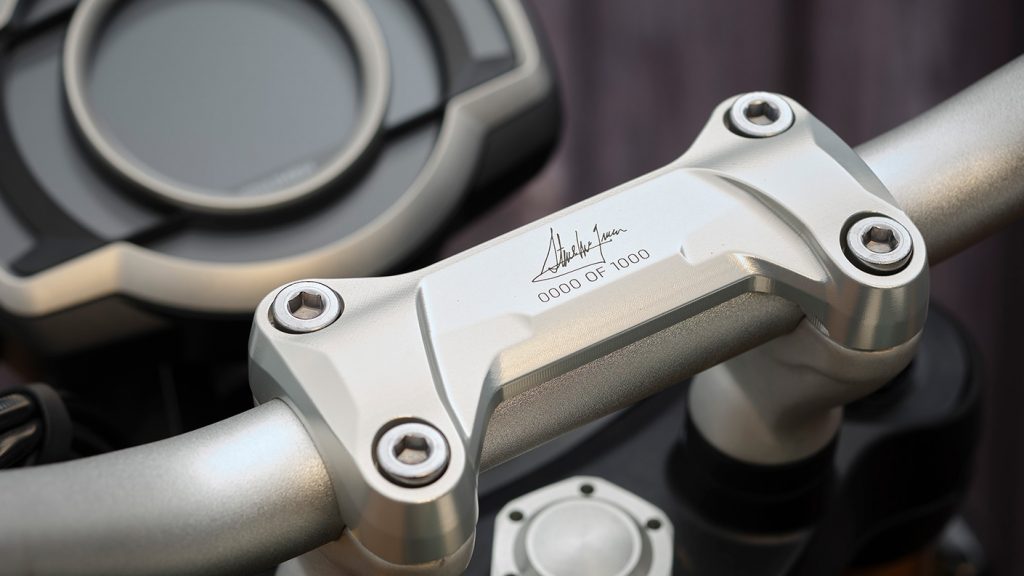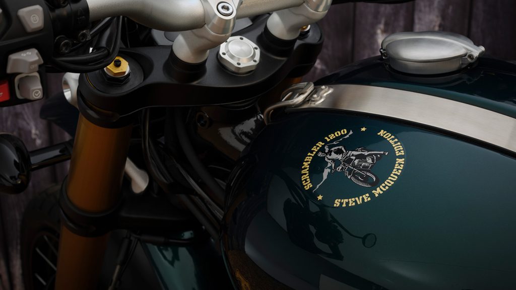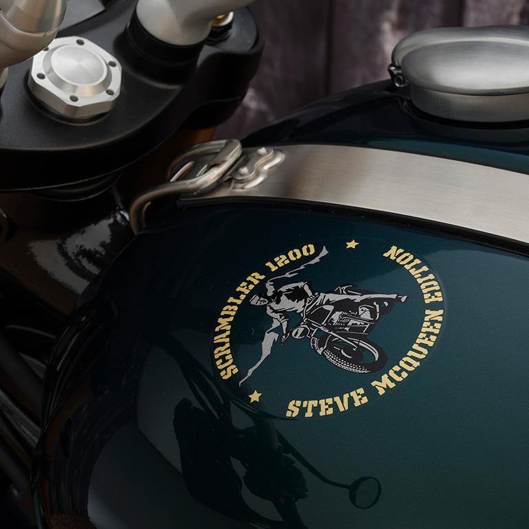 Each of the 1,000 Scrambler 1200 Steve McQueen Edition motorbikes boasts a distinctive gold and silver tank graphic, which depicts McQueen and his iconic Triumph and the spectacular contemporary classic Scrambler styling with category-leading finish and detailing is a ride like no other. Crafted aluminium parts and brushed badges are highlighted against the deep, lustrous paint to make this bike a real one in a million.