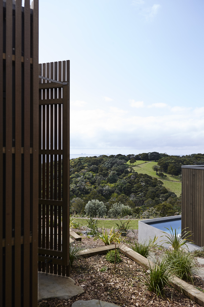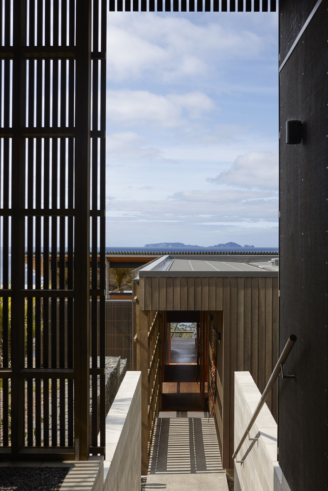 A view can make or break the appeal of a home and this Tutukaka House has some of the most impressive you’re likely to encounter and the ability to see Poor Knights Islands from the property is a real bonus. It begins with a carport that has an agrarian feel (where the owners’ much loved camper van is parked), continues between two block walls that solidly channel the arrival, and on down along rain-screened walkways and across a glass-walled bridge that links to the heart of the home, set on a perpendicular plane.