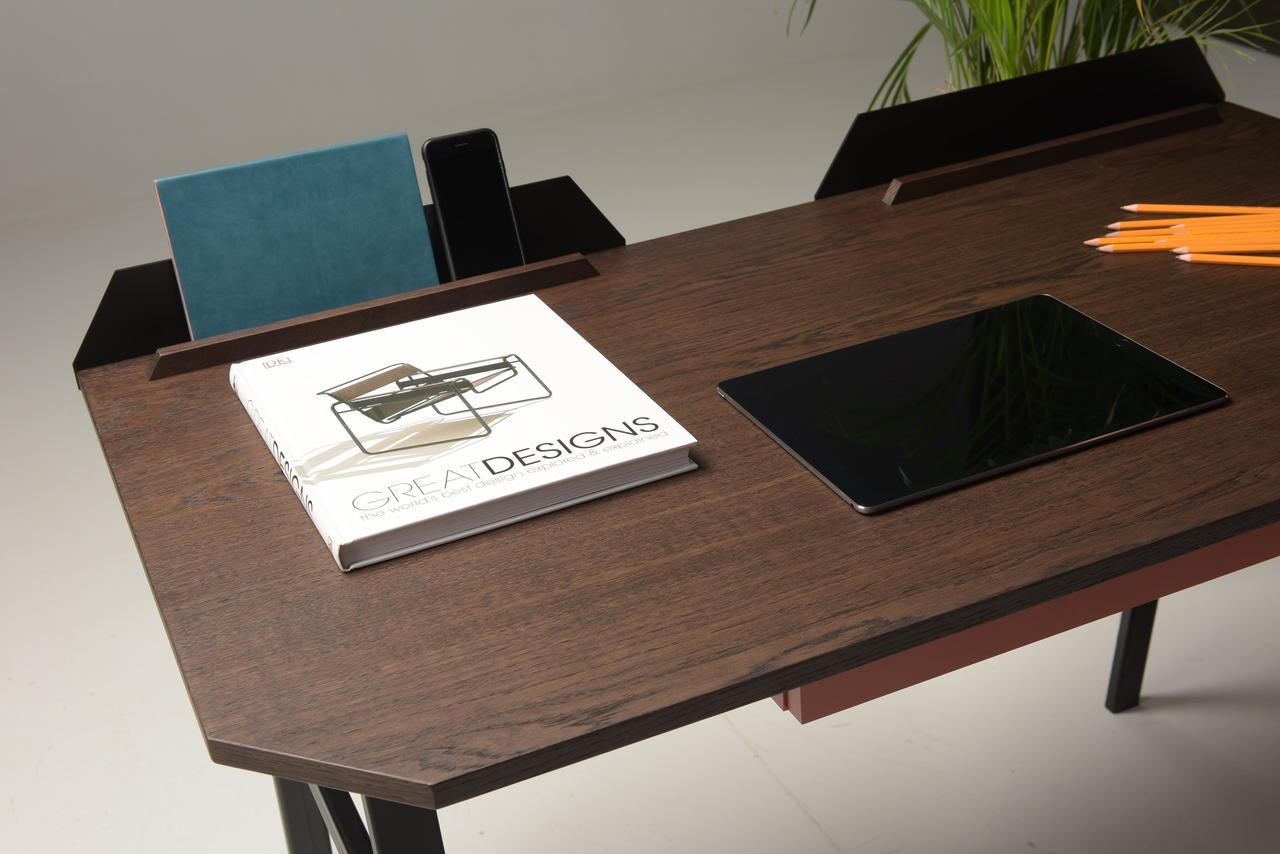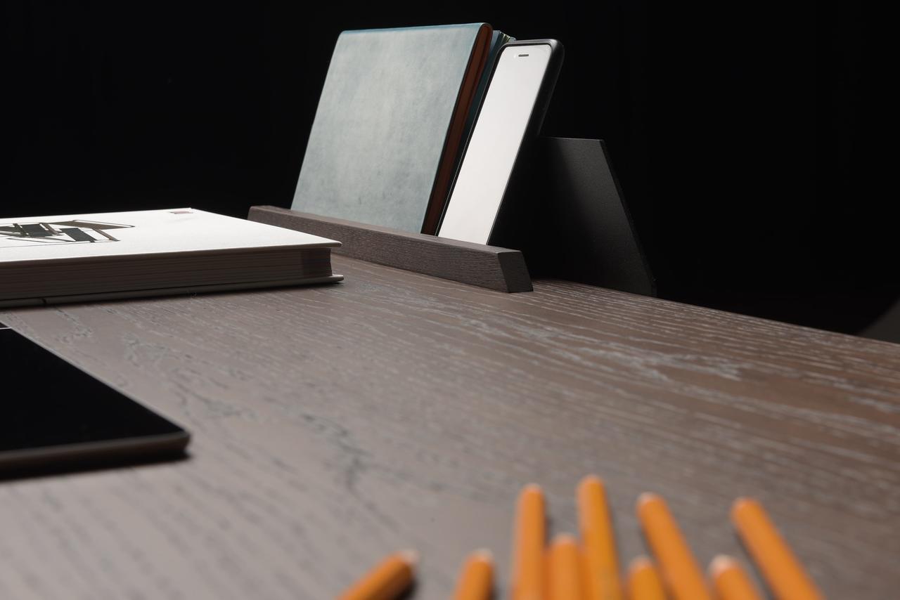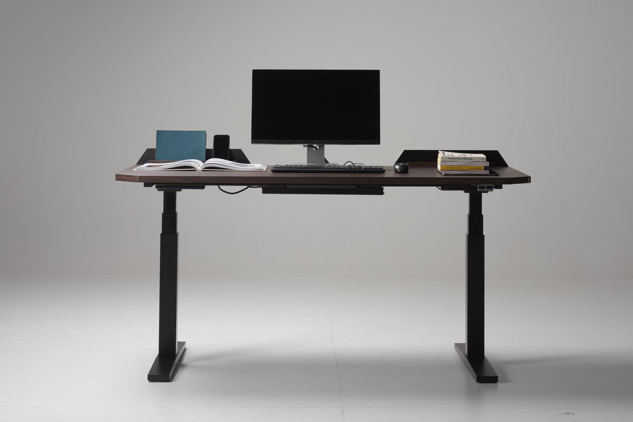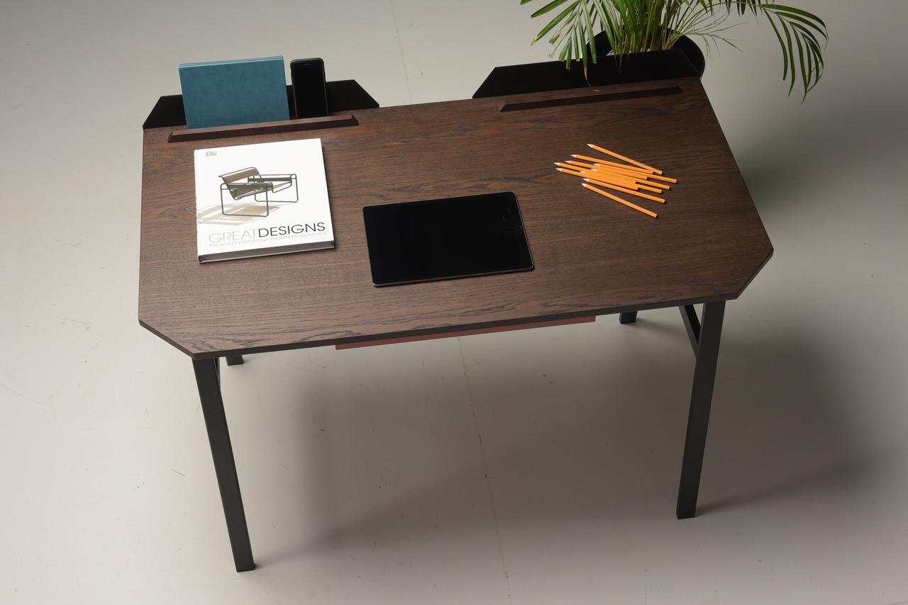 The contemporary design of the Pavel Vetrov designed UFO Lift Desk is coupled with an integrated vertical storage and display system which delivers an easy sight line to their sidekick mobile device screens such as smartphones, iPads and so forth. This fantastic piece of furniture design has a bold metal frame with a wood top design and a two-button lift motor which lets users switch between sitting and standing. A versatile metal stands is situated at the back of the desk surface and is designed to hold your EDC such as phones, keys, tablets and wallets.
