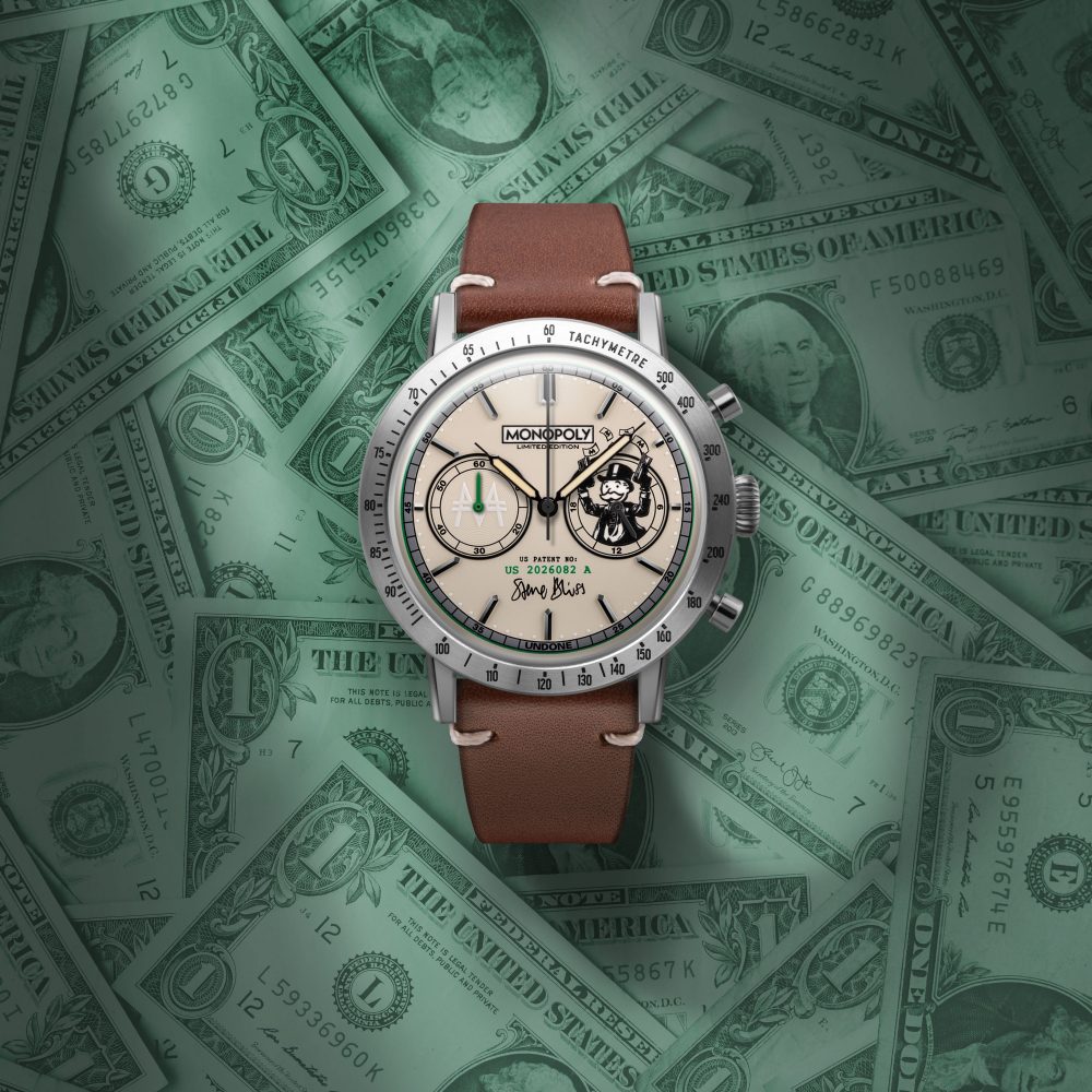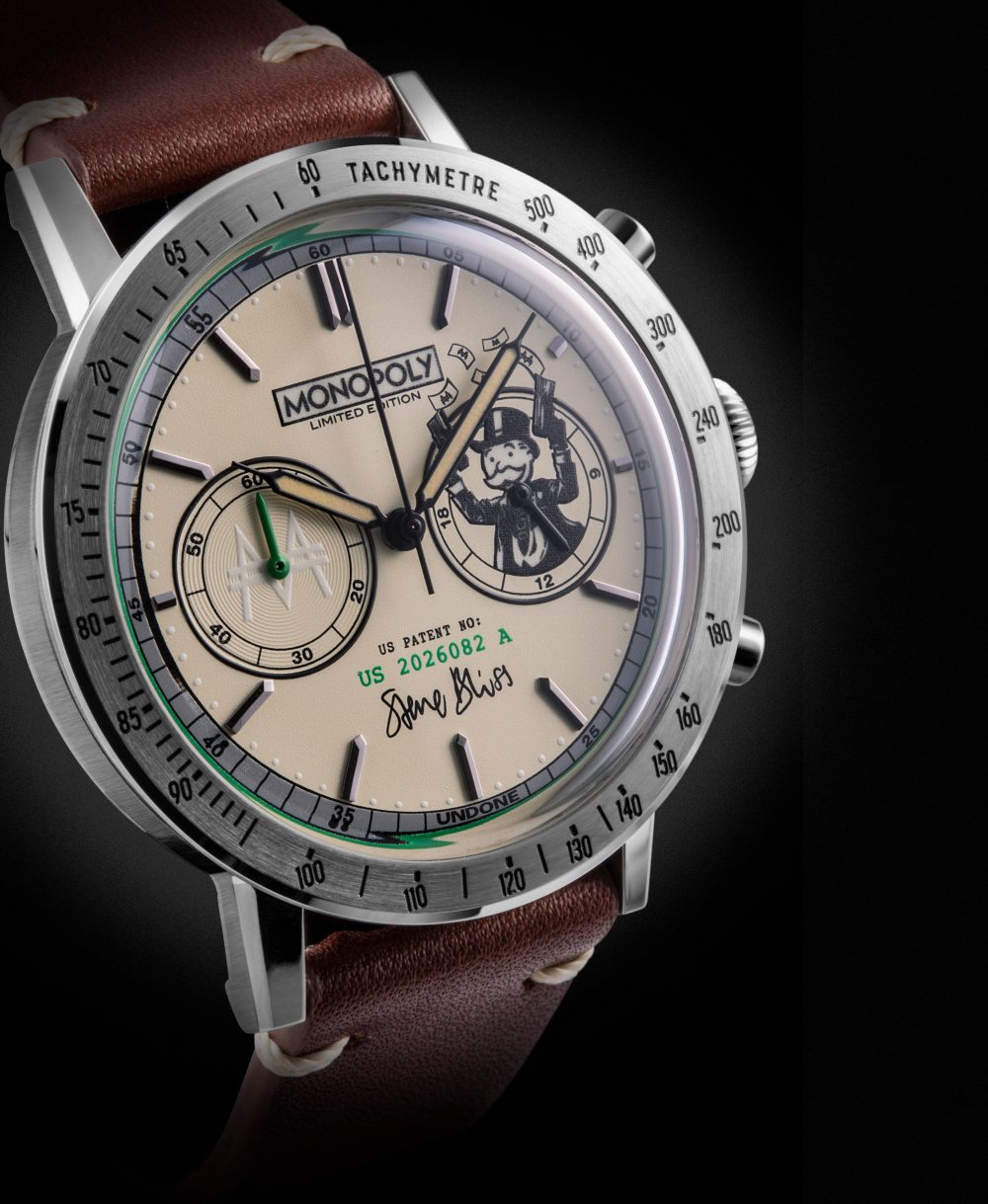 There are two different watches to choose from with the UNDONE x Monopoly Collection so you can choose the one that best suits your style. The first of which is “The Benjamin” by Stephen Bliss which is a United States Series 2006A, $100 bank note you can wear on your wrist. Signed off not by the US Secretary of Treasury but by Stephen himself; the dial boasts the authentic Monopoly board game patent number (“No.2,026,082” which was registered by the Parker Brothers back in December 31, 1935) cleverly disguised as a U.S. Mint issuance number. The green back themed watch is complimented by Genuine Brown Calf straps featuring UNDONE’s signature quick-release technology.