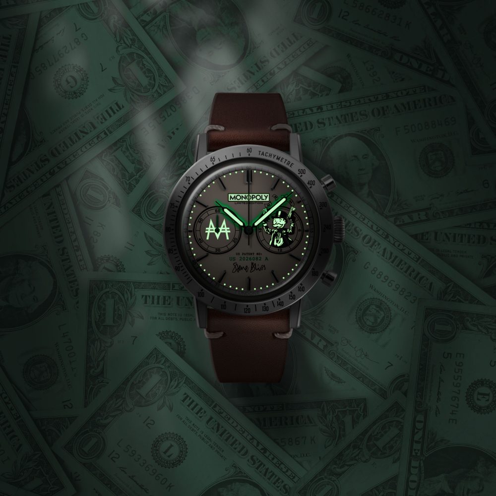 The second watch in the collection is “The Godfather” which has all the elements and subtleties that you would expect of a classy dress watch; applied indices, a Monopoly-red minute track along with the blend of brush and polished finishing which ensures an elegant feel without the garishness of too-much gold. The Black Cordura quick-release strap makes this a versatile piece which is ideally suited for both formal and casual occasions. The gold-pressed banknotes spraying out from Mr Monopoly’s twin cash cannons against the guillochéd subdials are only visible from certain angles. This is definitely a timepiece for those who want a real conversation starter on their wrist.