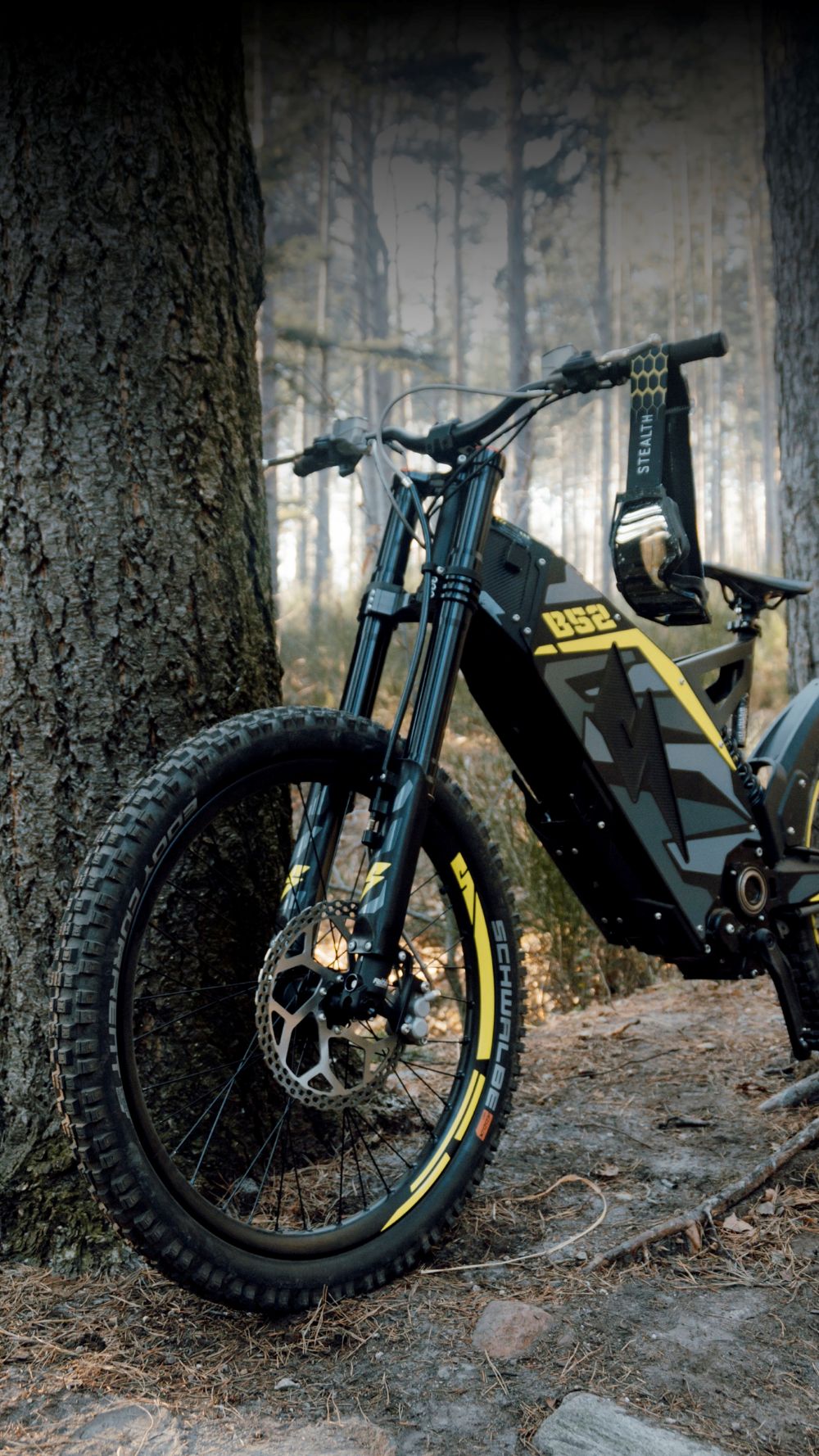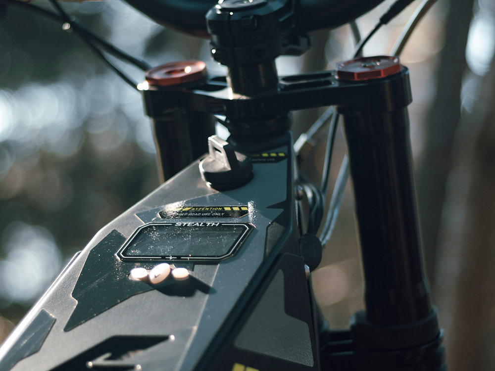 But power without control is chaos, and Stealth has meticulously engineered the B52-R for unparalleled precision and handling. Its robust monocoque steel chassis provides an unyielding foundation, built to shrug off the toughest terrain. The enduro-inspired suspension system is equally impressive, featuring 180mm of Fast Ace front travel and 200mm of rear travel, ensuring that even the most unforgiving trails feel like a smooth ribbon of asphalt. The 27.5” front and 21” rear knobby tires are designed to grip tenaciously, providing the confidence to push limits. And when it’s time to rein in this untamed power, the 250mm motorcycle-grade rotors and four-piston calipers provide immense stopping force, complemented by an adjustable regenerative-braking system that not only enhances control but also contributes to the bike’s impressive range.