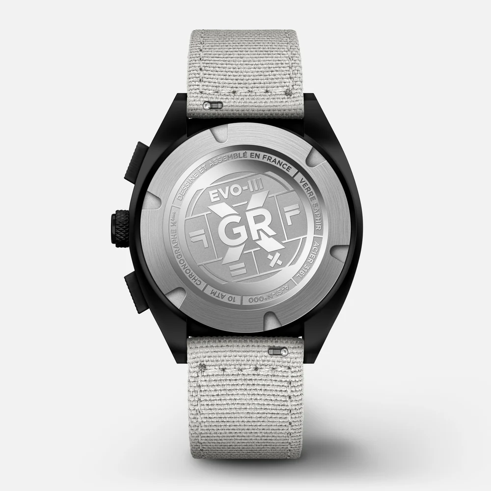Drawing inspiration from classic field watches, the GRX collection adapts that utilitarian style into something resolutely modern and technical, while maintaining a clean, minimalist look. Designed with practicality and readability at the forefront, the watch imposes a look that is both functional and sharp. It’s housed in a 39mm diameter 316L steel case with a black PVD coating, measuring 45mm in length (likely lug-to-lug) and 10.9mm thick (excluding the glass). The case features a blend of sandblasted and brushed finishes, accented by a polished bevel – tactile details that speak to thoughtful execution. The steel screwed case back is marked with the distinctive “GRX” crest.