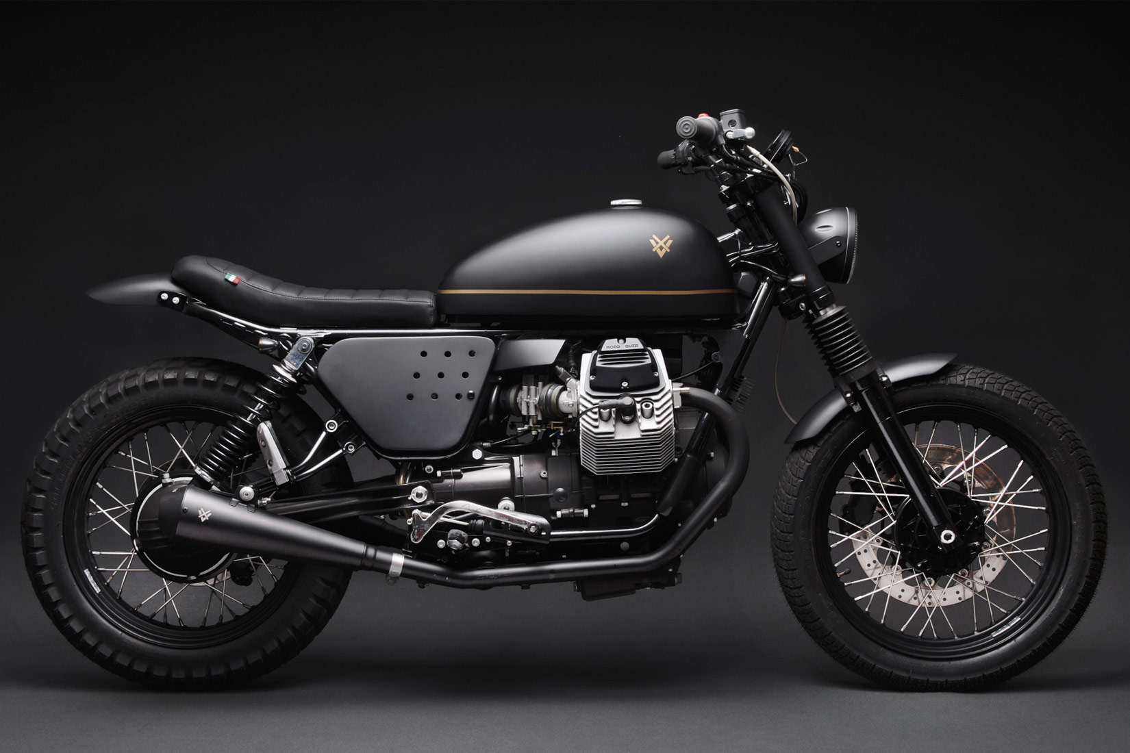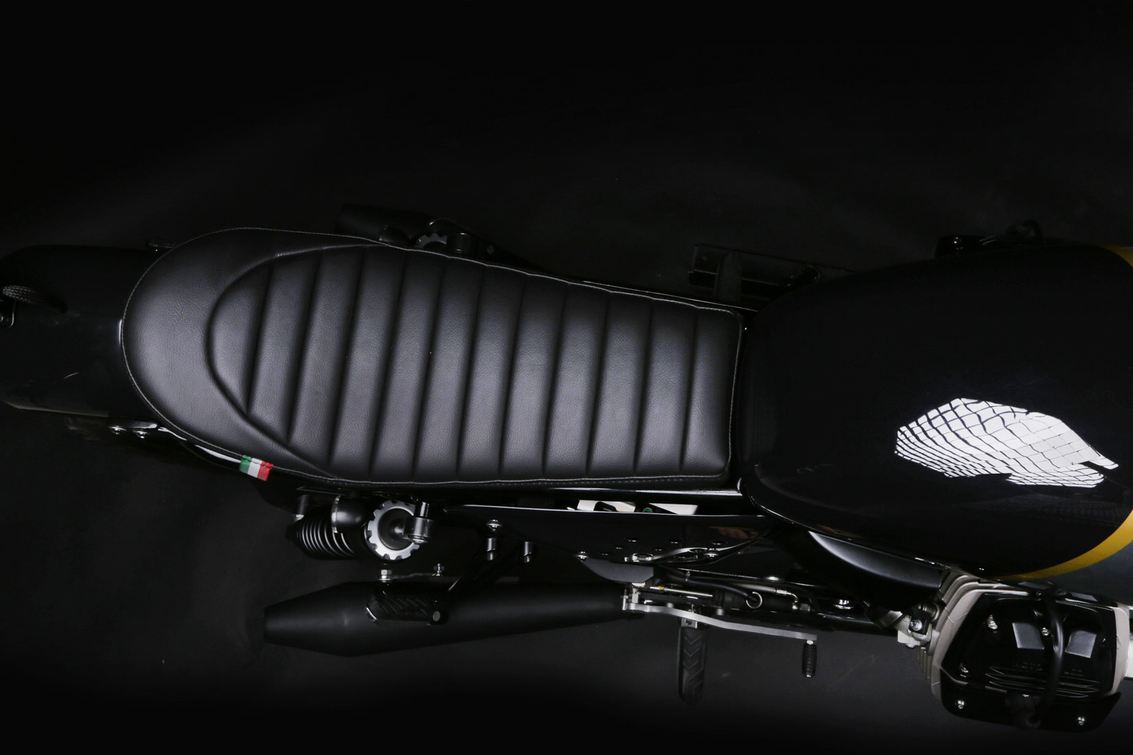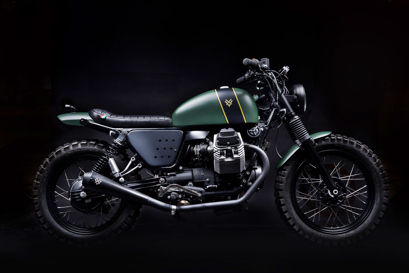 Impressive from top to bottom, the Tractor Motorbikes are the first Moto Guzzi Scrambler Venier made that boasts the new generation of hand crafted aluminium bodywork. The tank has been elongated and reshaped, and the tail section completely redone with a new hand made leather seat and a recessed LED tail light and new rear fender. These breathtaking bikes also have a 4”headlight with custom brackets, black aluminium handlebar, GPS custom speedo with Venier logo, new grips, custom mufflers have been made for the bike by Mass Moto in Sicily. Last but not least, you have the hand crafted aluminium sides and front fender which finish the bodywork off in style.